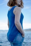 Marin ist ein Sommershirt mit einem Twist. Es ist asymmetrisch und hat eine A-Linienform. Die Textur von Marin wird durch das Schrägstricken betont.