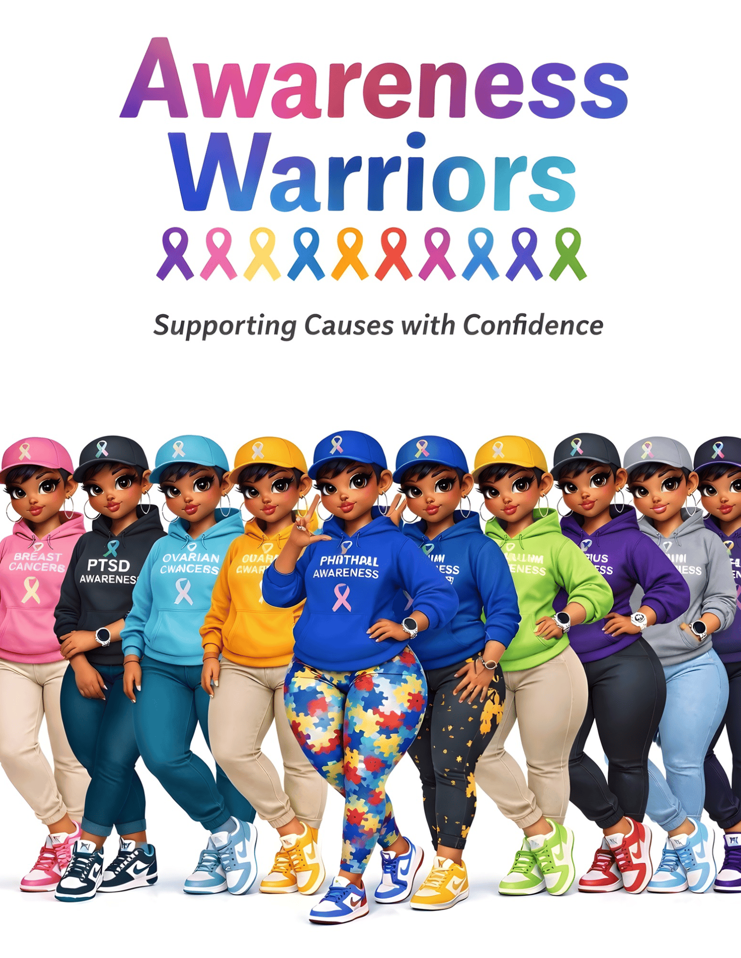 The Awareness Warriors Collection is a powerful digital design celebrating strength, unity, and advocacy across multiple health and social awareness causes. Featuring vibrant, fashion-forward warrior characters dressed in color-coordinated awareness apparel, this design is made to inspire confidence while amplifying meaningful conversations.
