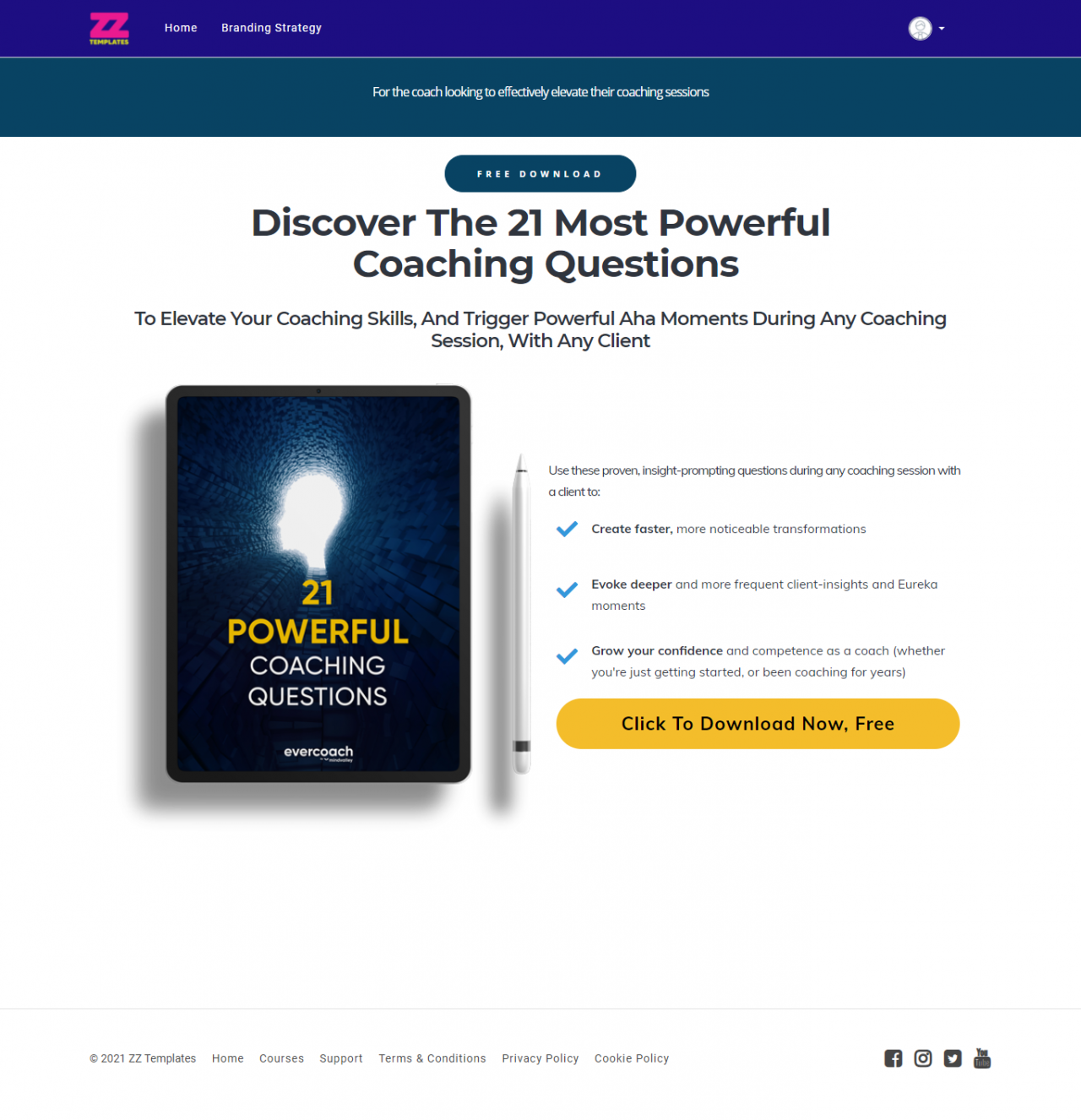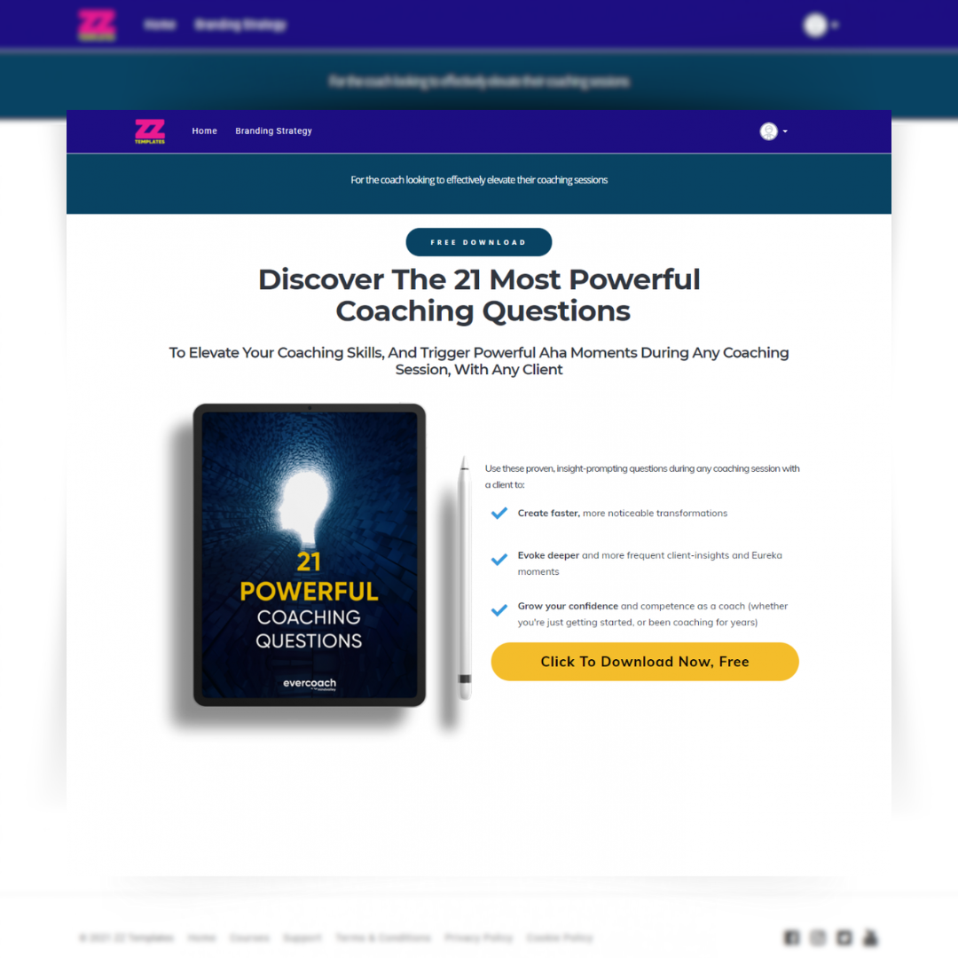 Enhance your coaching sessions with our Coaching Questions eBook Landing Page template. Perfect for coaches aiming to elevate their skills, this template features a compelling call-to-action for a free download, insightful content highlights, and visually engaging design.