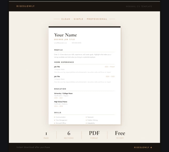 This minimal one-page CV template was made for beginners — people who are just starting out and need a professional CV without the stress of designing one from scratch. Every section is already laid out and guided with placeholder text so you always know exactly what to write.