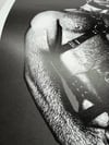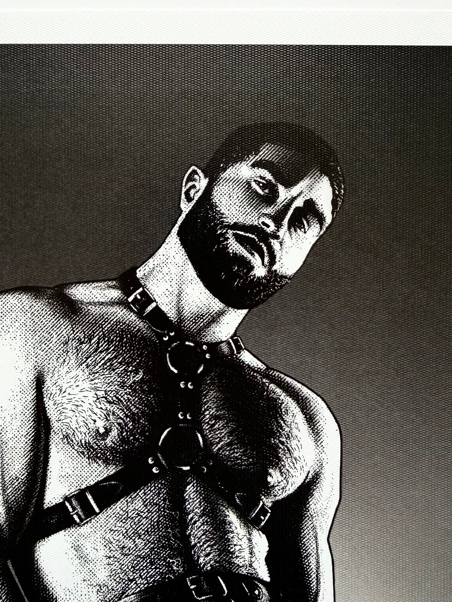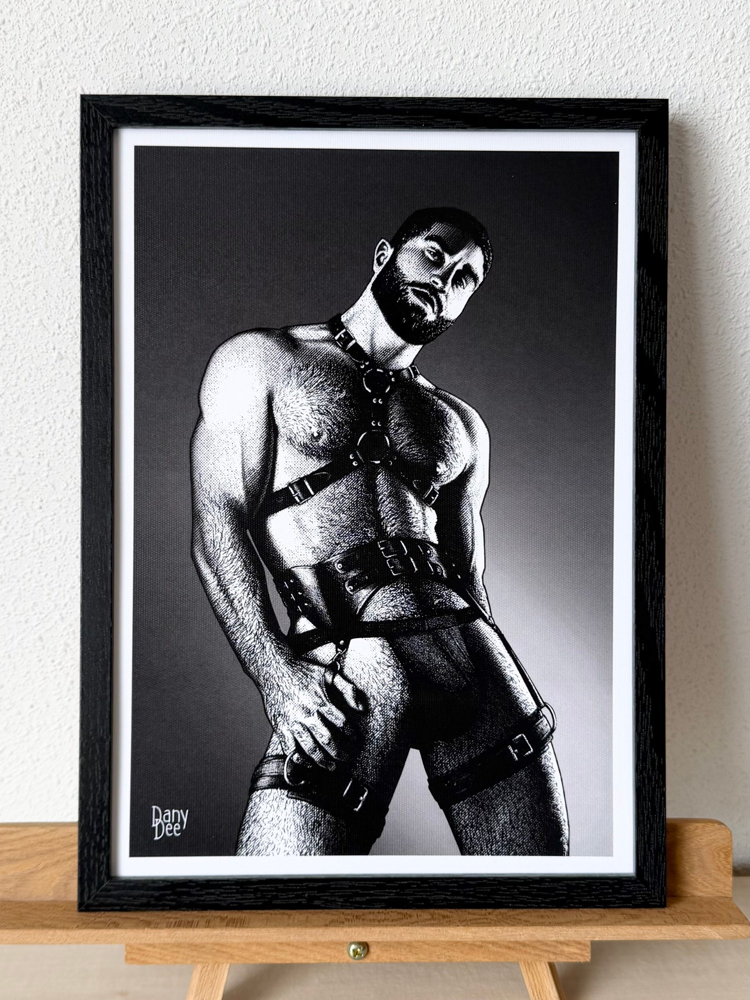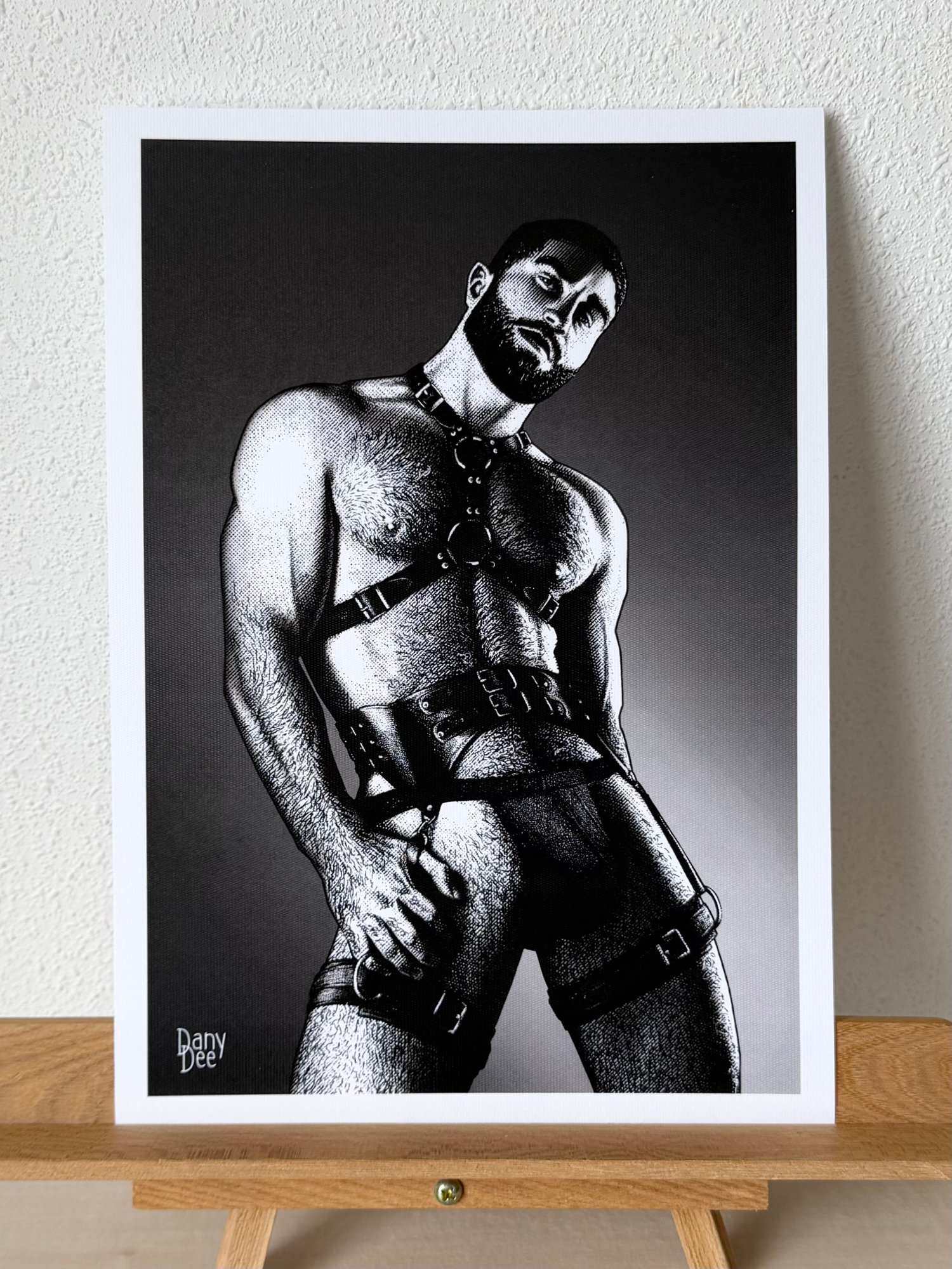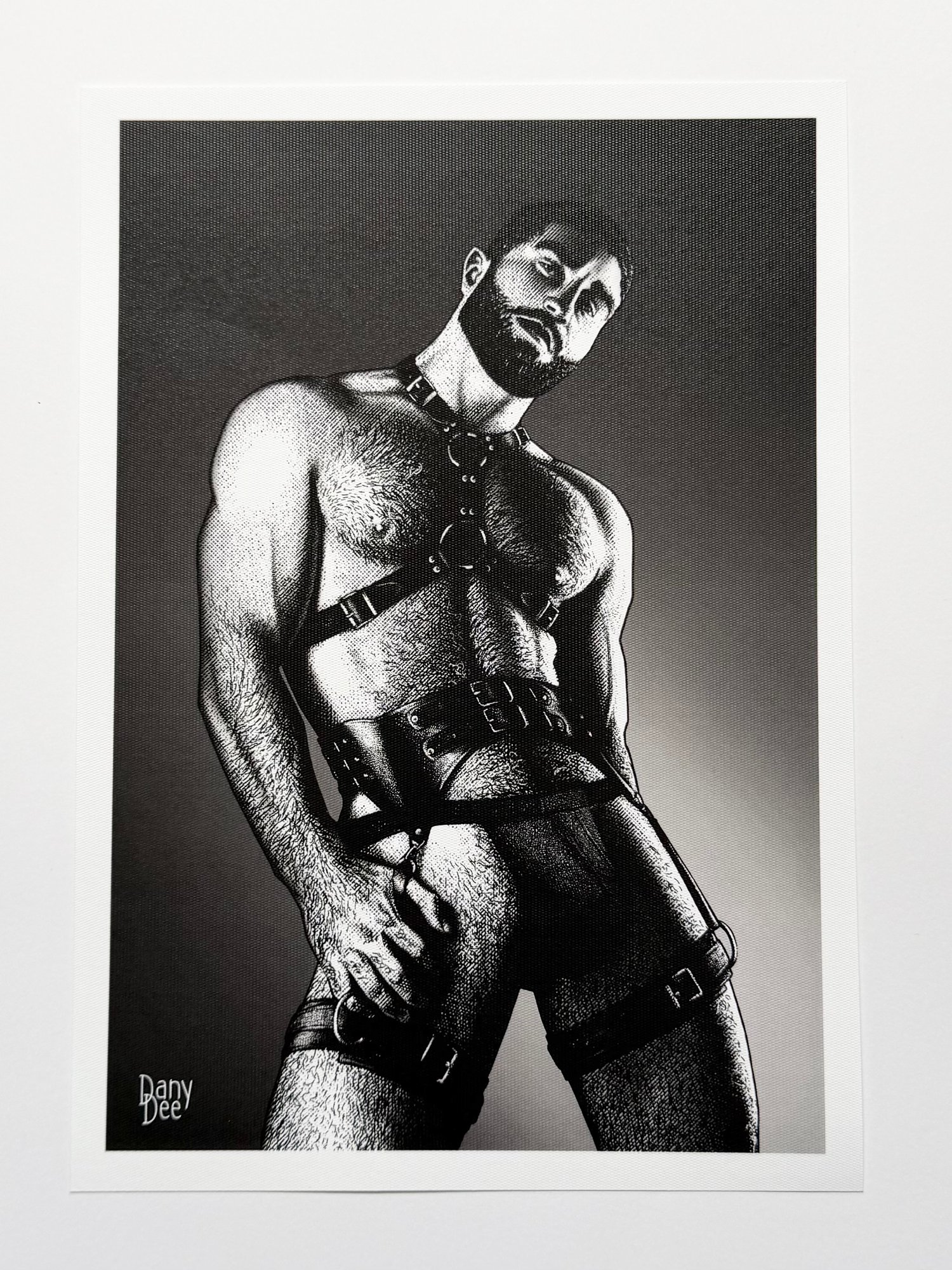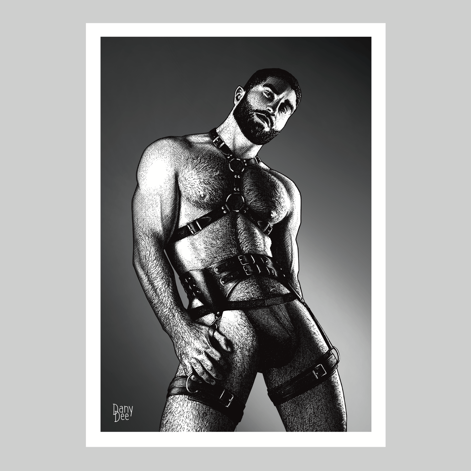 "The Ritual" is a hand-drawn, monochromatic A4 art print celebrating gay leather harness culture — a bold homoerotic illustration of a bearded, powerfully built man in a full leather harness and collar, perfect for gay leather fetish collectors or queer home decor.