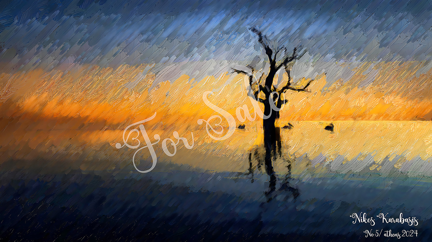 The colours of east and west in a feast of mixture with the background of a tree without leaves or fruits. A dark figure playing like an apparition between the blue of the sky and the dark of the earth. And what are the three figures "after the tree"? Is it a lake or a fog? What exactly do we see in our footsteps?