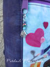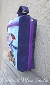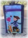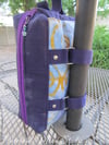 On the front of the pouch I added an applique of a girl on a motorized scooter. There is a zipper pocket on the front that is handy for a phone or keys, etc. The main compartment unzips around the pouch and is quite roomy inside. I didn't have an actual scooter to photograph this pouch on, so I show the back straps around an unmbrella pole in an outdoor table to give you the idea of how it looks attached to a post.