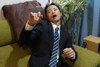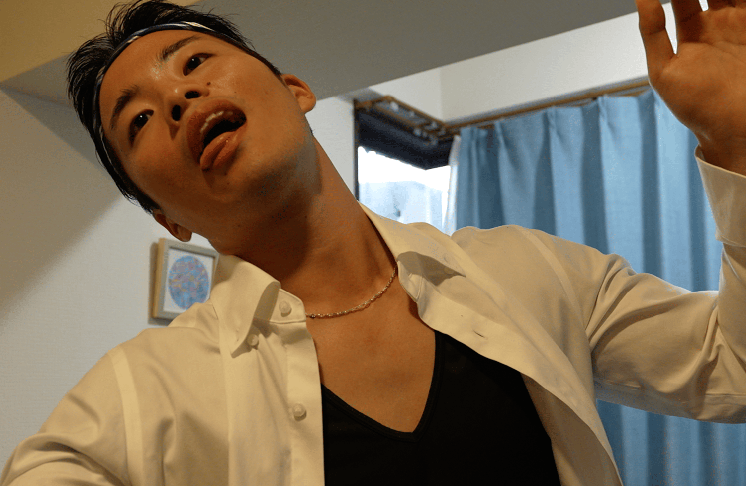 Takumi is back from office and I use a remote control to freeze him while drinking beer. I take off his suit and after he freezes and plays me. After he is made bare chest, I lay his stiff body on the sofa and expose one of his feet.