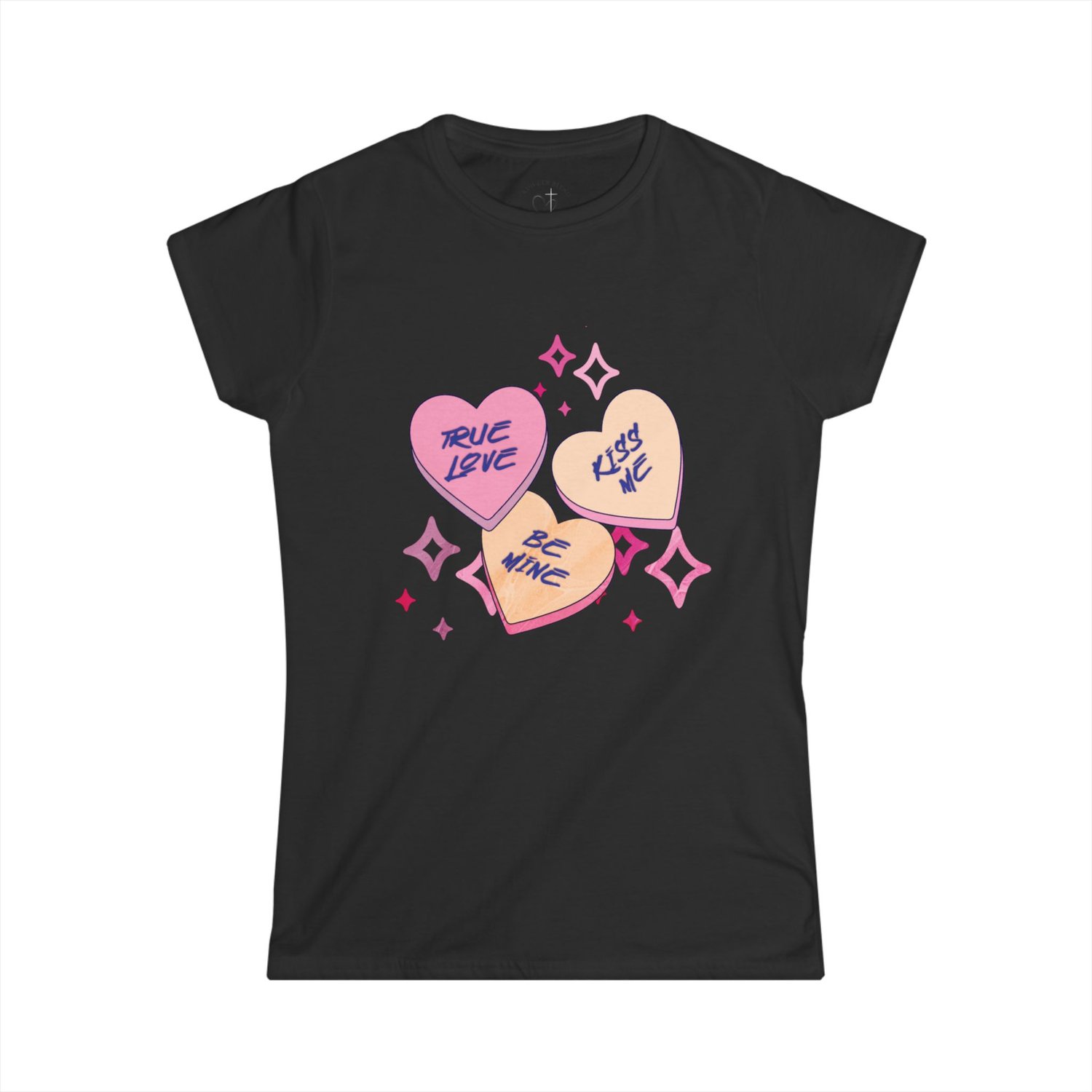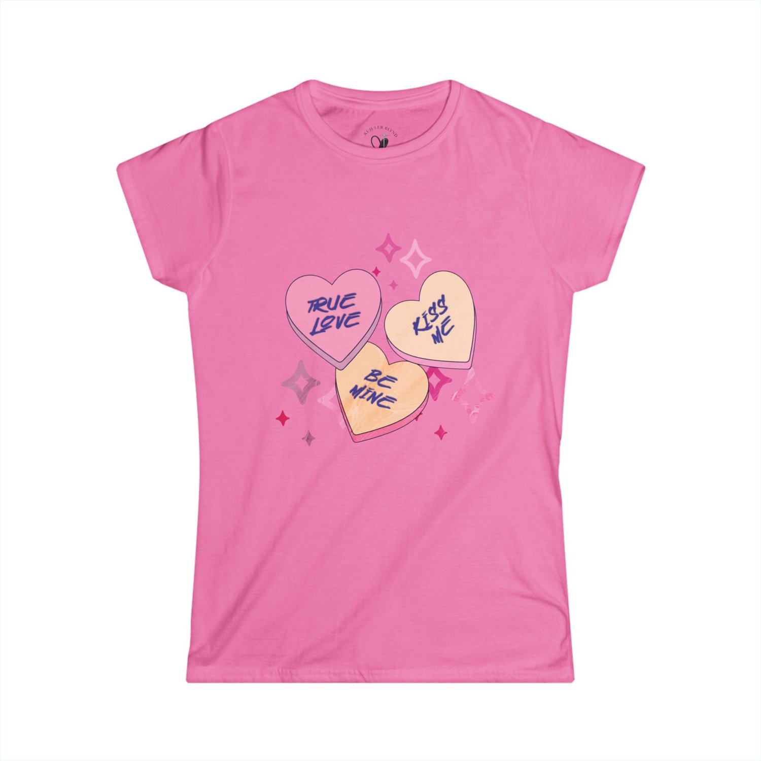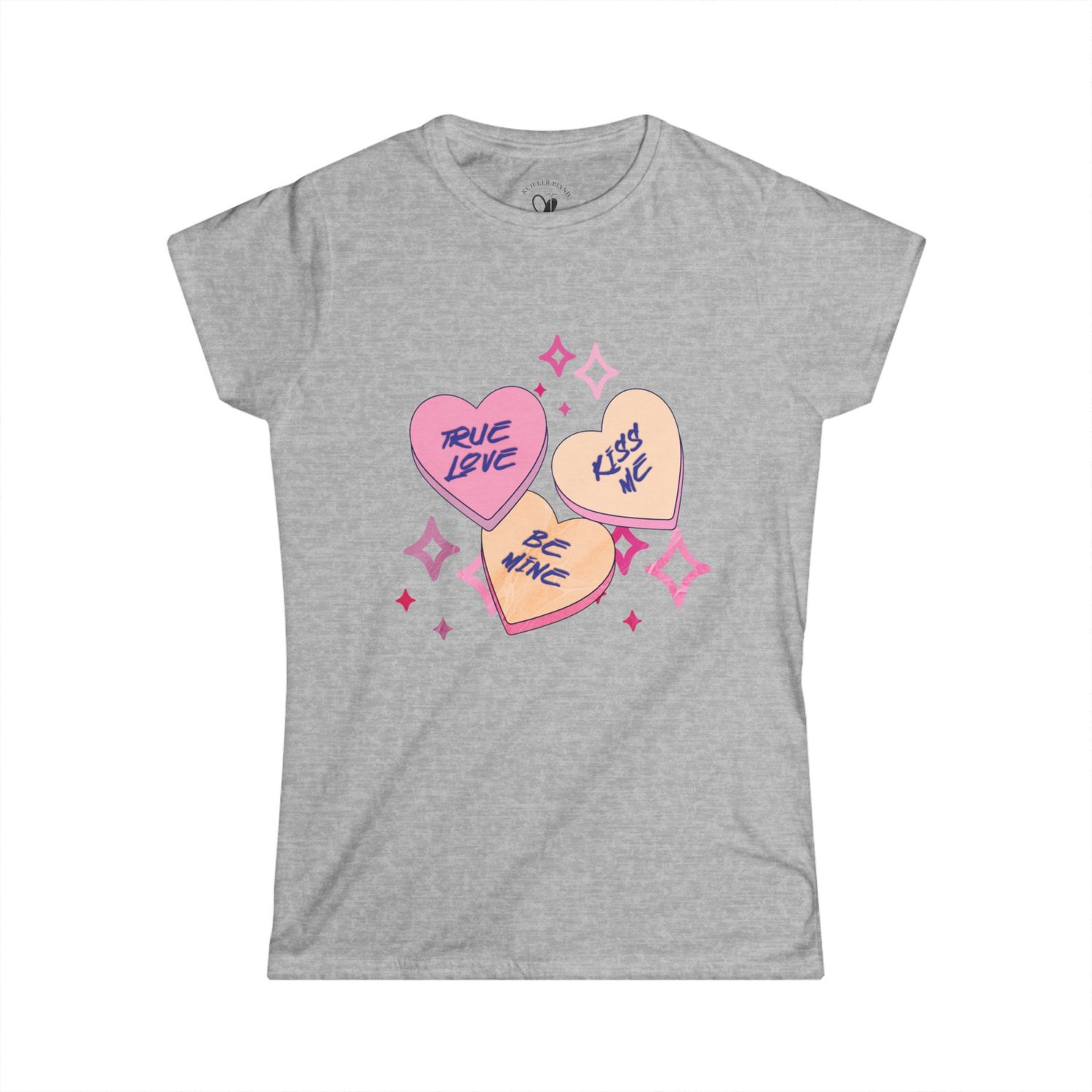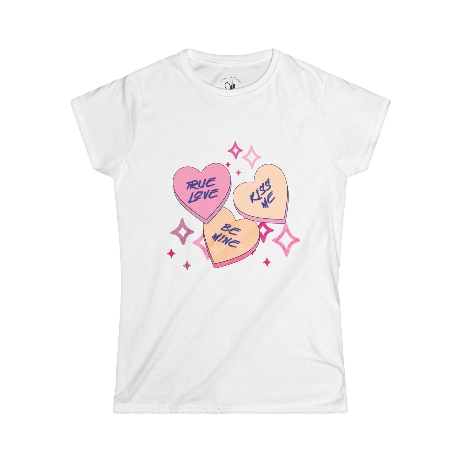 A soft and comfortable women's tee featuring heart candies with Valentine's Day quotes, perfect for adding a touch of romance to your casual outfits. Ideal for women looking for a cute and festive top to wear during Valentine's Day celebrations.