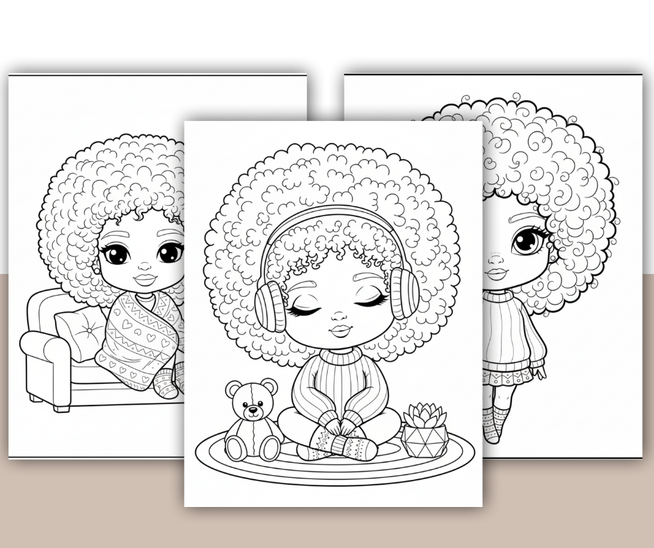 Cozy Chibi Soft Life is a 10-page adult coloring book designed for Black women who love relaxing, cute, and cozy moments. Each page features a chibi-style Black girl with fluffy, fully colorable afro hair in gentle, cozy poses — perfect for stress relief, self-care, and reconnecting with your soft-life energy.