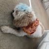 Hand crafted one of a kind pet bandanna of 100% cotton fabric. My bandannas are lightweight and fit over the collar for convenience and comfort. I sew bandannas in my quilting studio in our home when I am not busy quilting.