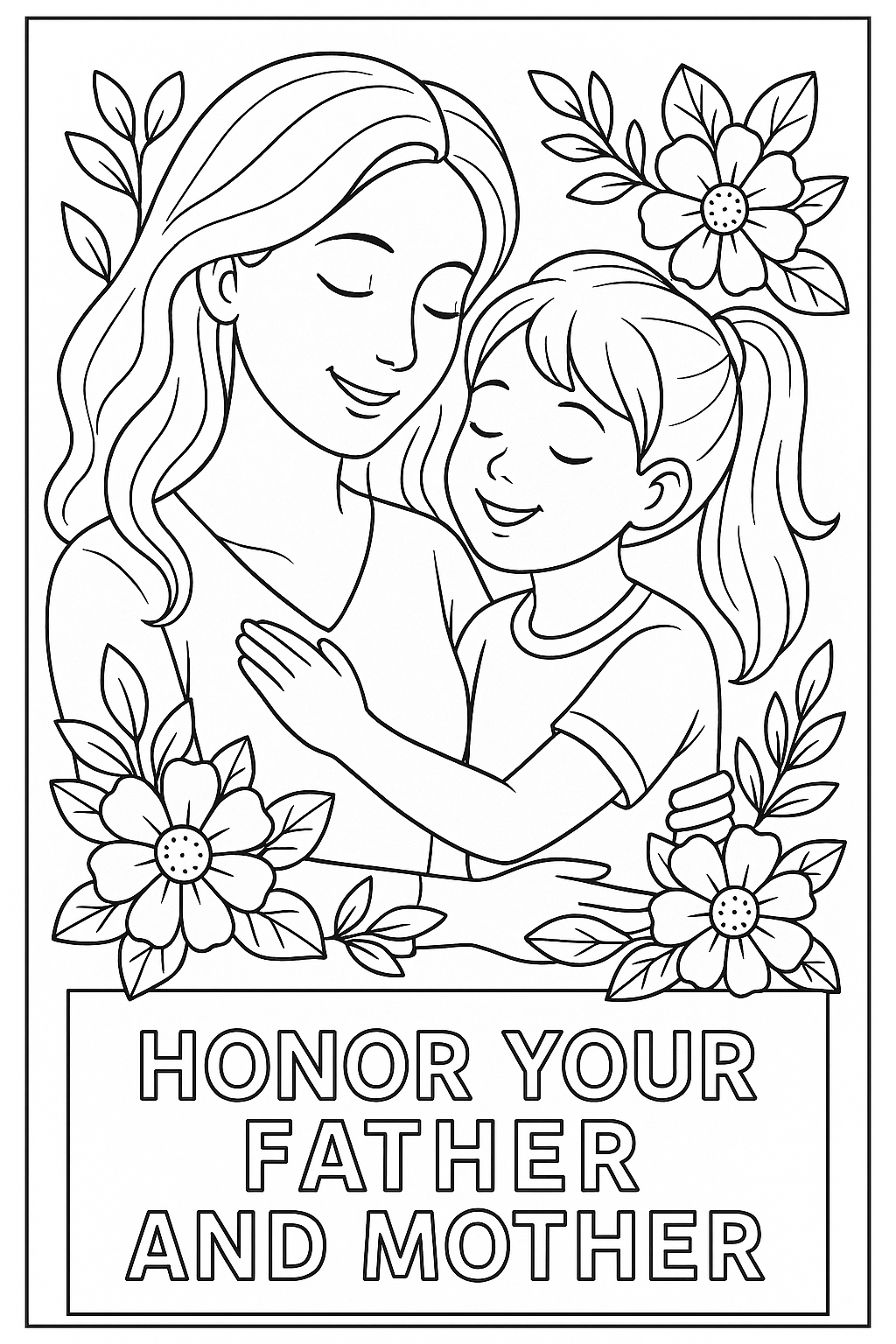 Celebrate love, legacy, and biblical truth with this Family Embrace Coloring Page, featuring a mother and daughter in a warm, joyful hug surrounded by blooming flowers and leaves. Paired with the timeless command βHONOR YOUR FATHER AND MOTHER,β this printable invites reflection, gratitude, and creative worship β perfect for devotional kits, homeschool activities, or ministry gifts.