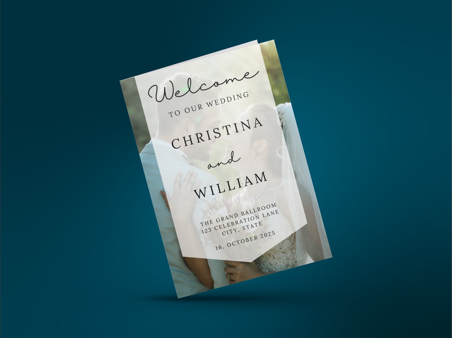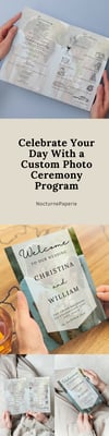 Highlight your love story with this photo wedding program template featuring a romantic couple background. This editable printable timeline card is perfect for adding a personal touch to your ceremony program.