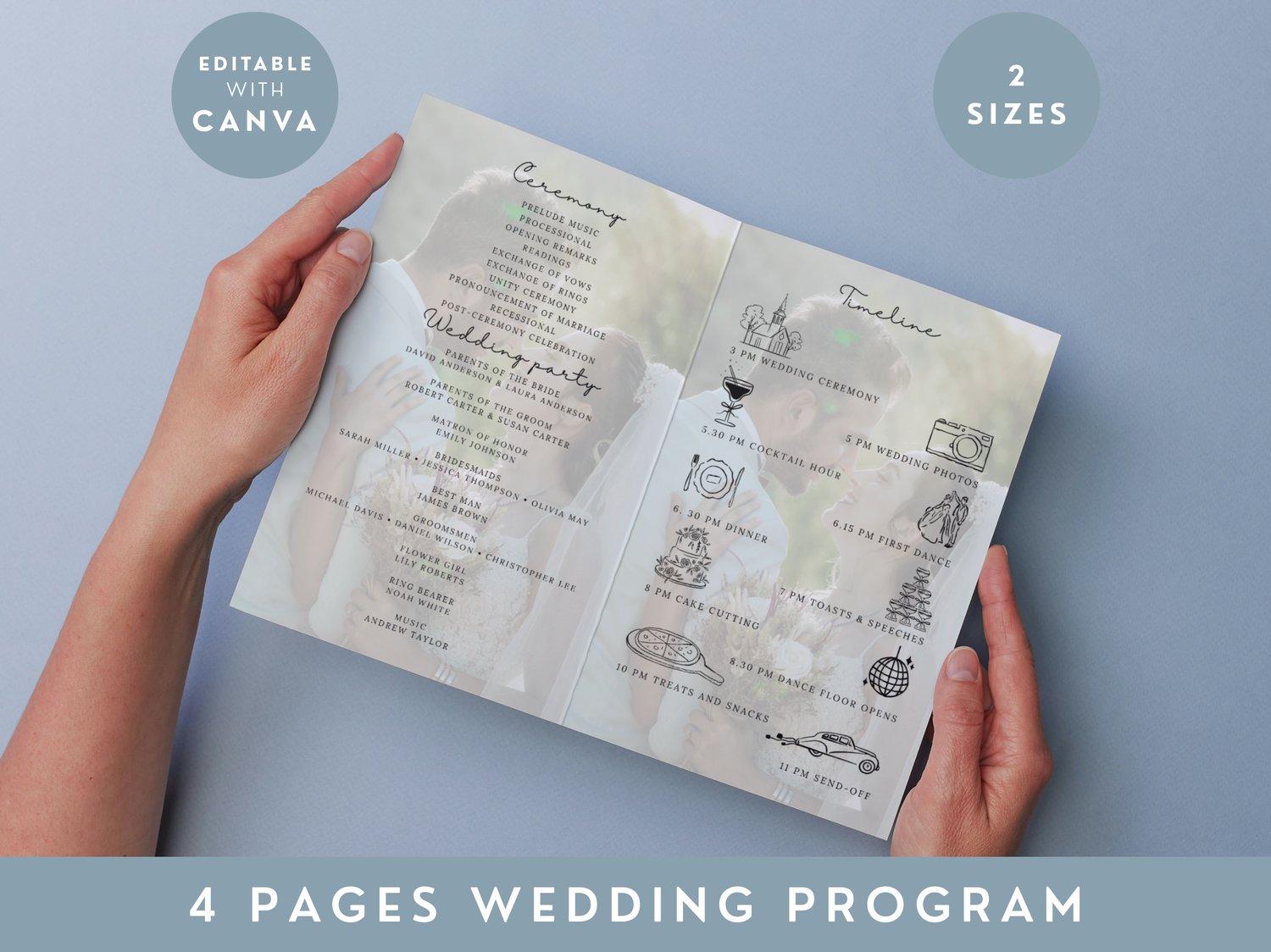 Photo Wedding Program Template With Romantic Couple Background Editable Timeline Printable Ceremony Program Design With Image Layout 009
