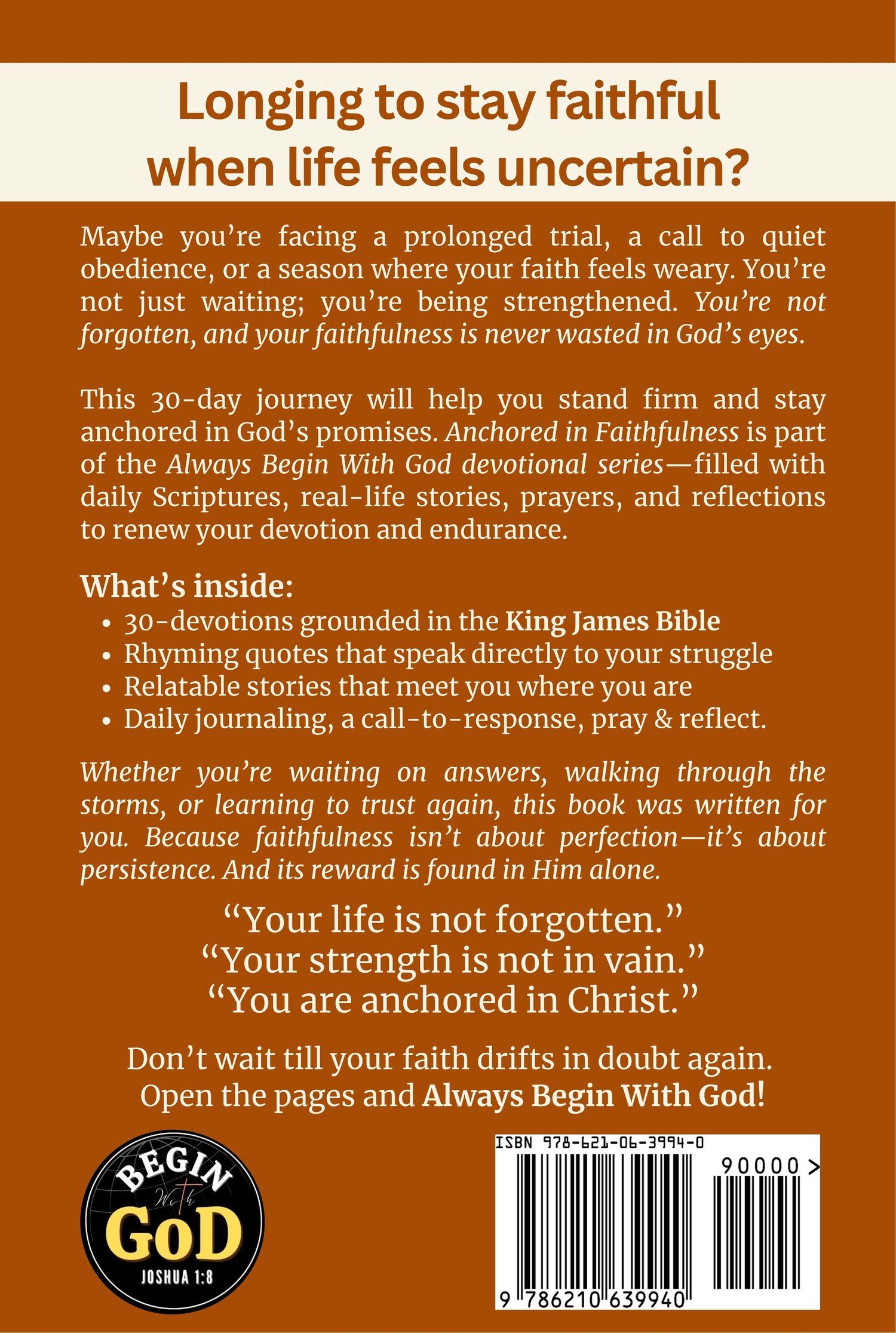 This isnโt just another devotionalโitโs your daily guide to standing firm when storms arise. Whether youโre waiting on answers, walking through trials, or simply learning to endure with grace, Anchored in Faithfulness will help you: