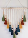 Elevate your space with this whimsical, one-of-a-kind macrame wall hanging, designed to infuse a playful bohemian or folk art style into any room. Whether it's your nursery, kid's room, entryway, kitchen, dining room, living room, bedroom, or home office, this handcrafted piece adds a vibrant touch. Crafted meticulously from 100% natural cotton, adorned with raw wooden beads and a dowel, this creation boasts attention to detail and durability with a touch of hot glue on the back to prevent fraying.
