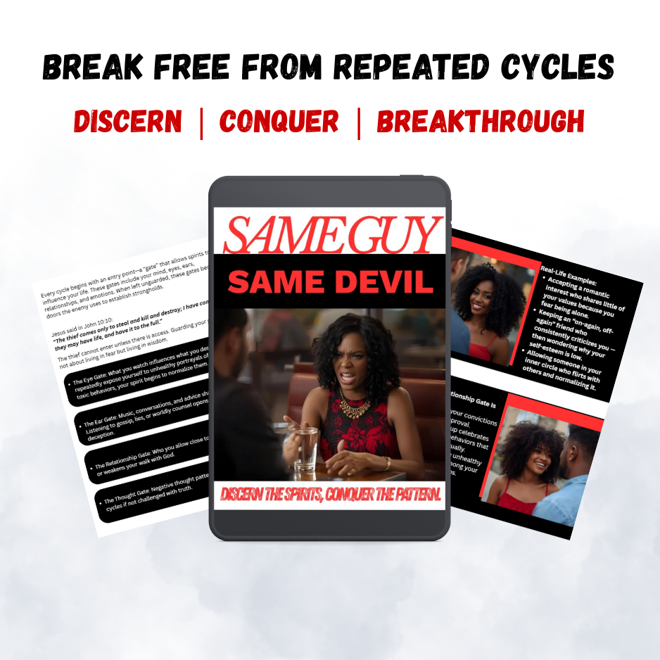 Same Guy, Same Devil: Discern the Spirits, Conquer the Pattern is a powerful Christian workbook designed to help you identify destructive cycles, break free from spiritual strongholds, and walk in lasting freedom. Through biblical teaching, prayer strategies, and interactive activities, this guide equips you to recognize familiar spirits, replace lies with God’s truth, and build a battle plan for victory.