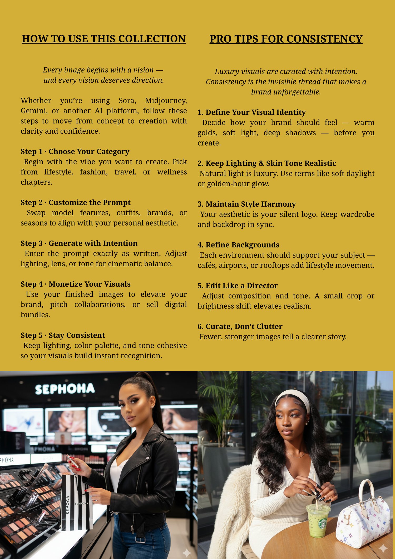 This collection includes 30+ finely crafted prompts — each written with lighting, lens, and realism details — to help you generate visuals with depth, drama, and polish. Whether you're a beginner or already creating content, these prompts make it easier to hit that high-end, fashion-editorial look that top brands desire.