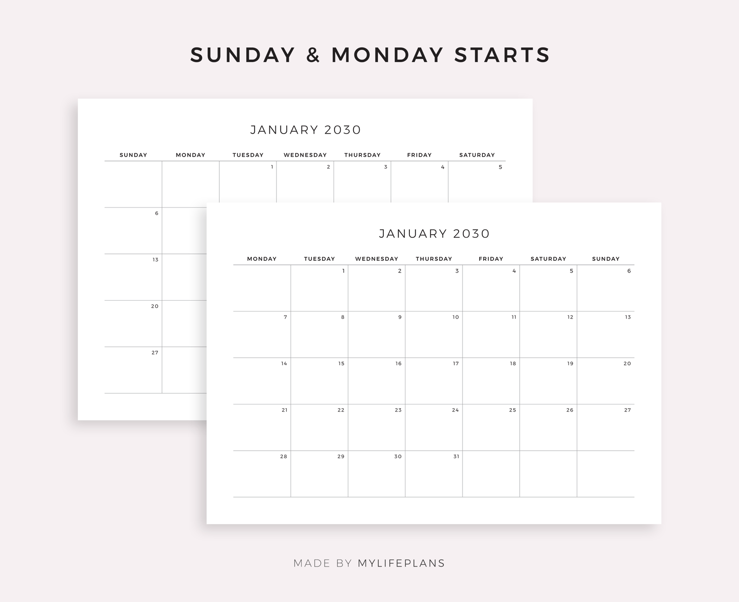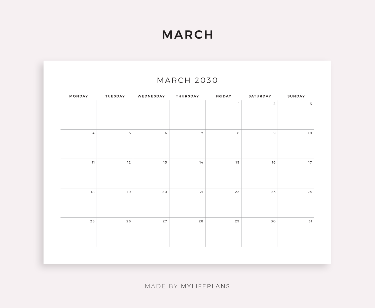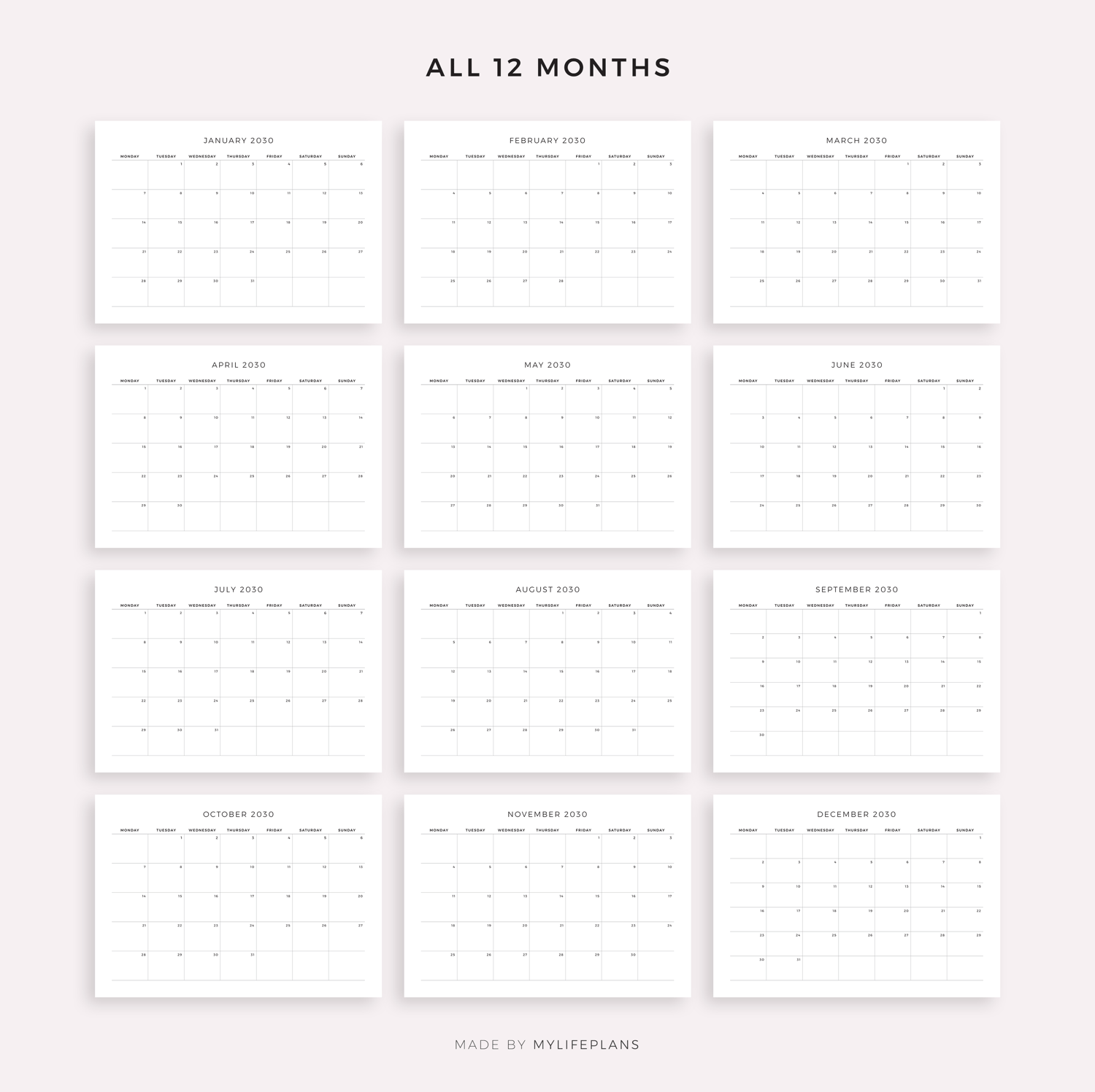 This is a printable 2030 monthly calendar — just download, print, and start using it right away.