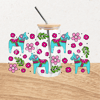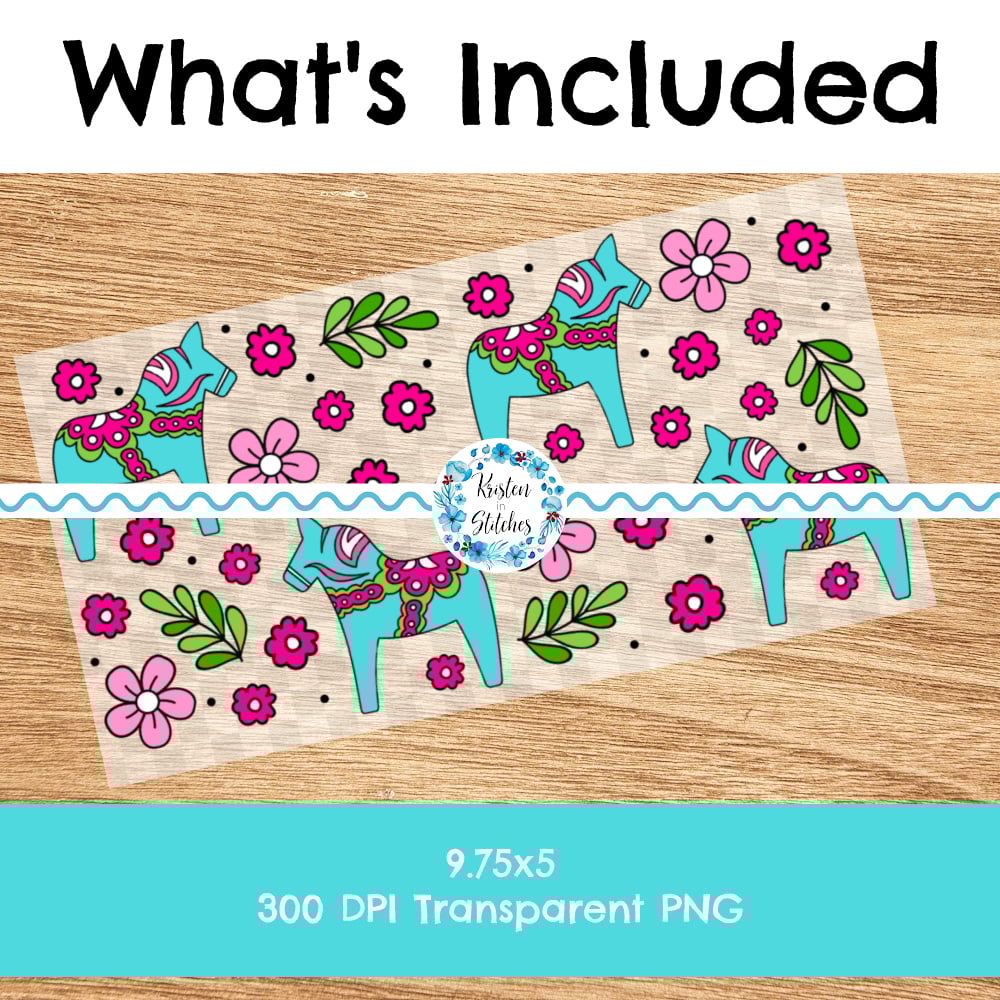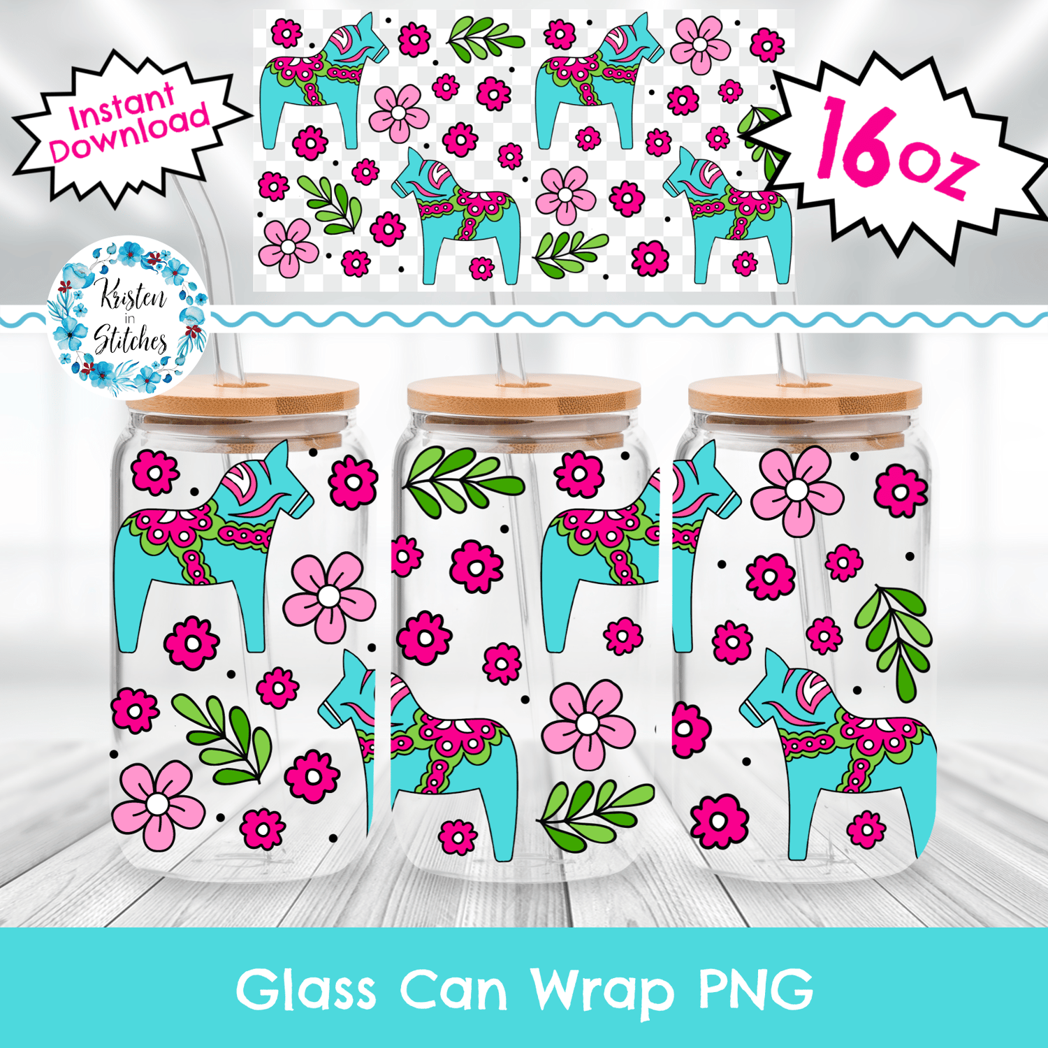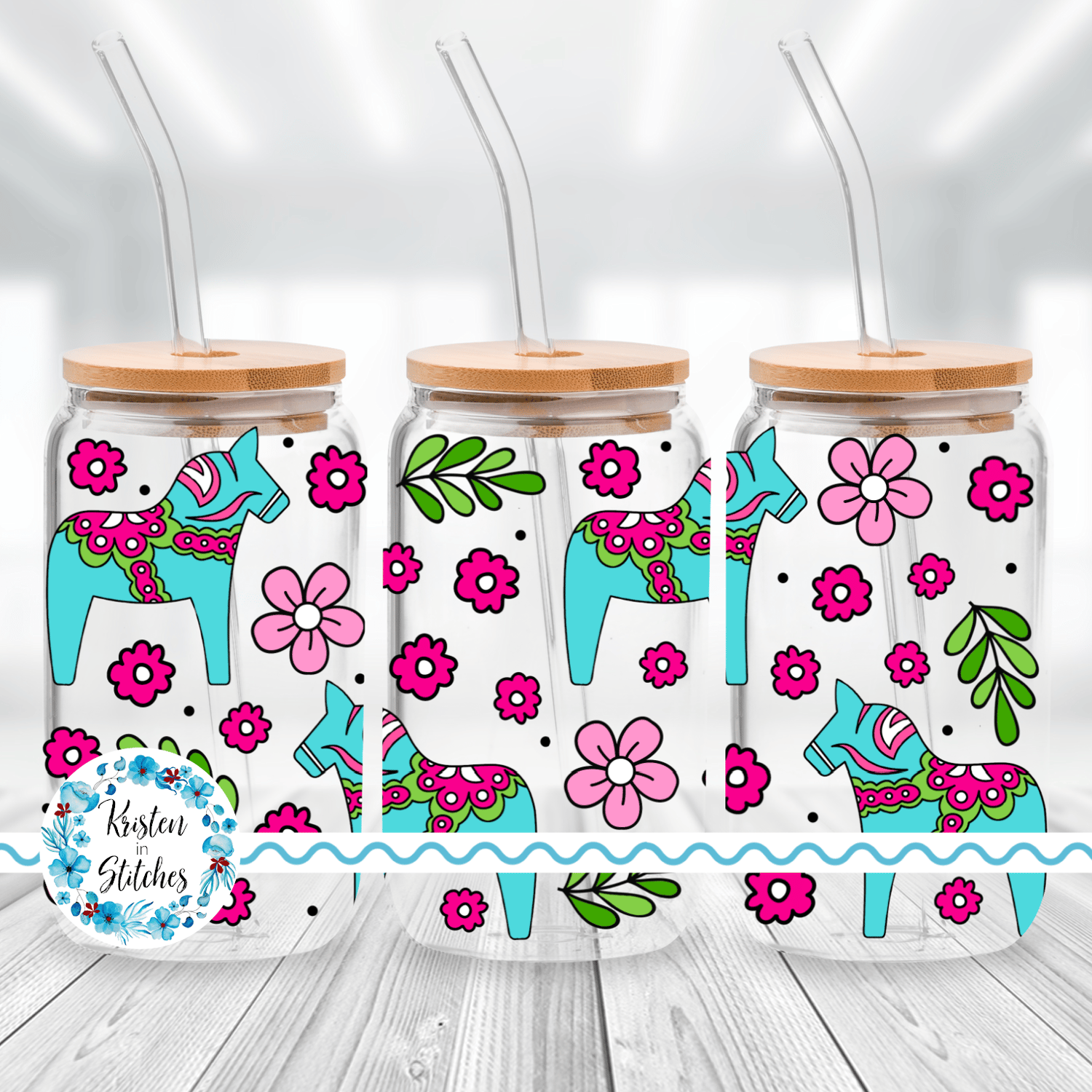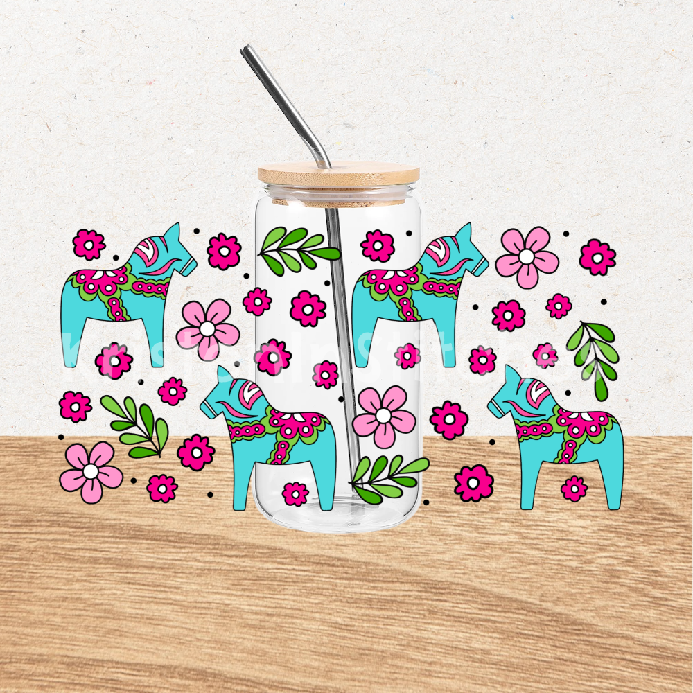Aqua and Pink Dala Horses Folk Floral Glass Can Wrap Transparent PNG