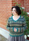 This is a pattern for a V-neck jumper knit using the Fair Isle knitting technique (though there are 2 rounds in the motif repeat which use 3 colours across). It is worked from the top down and either flat or in the round with a steek over the yoke. The body and sleeves are worked in the round.