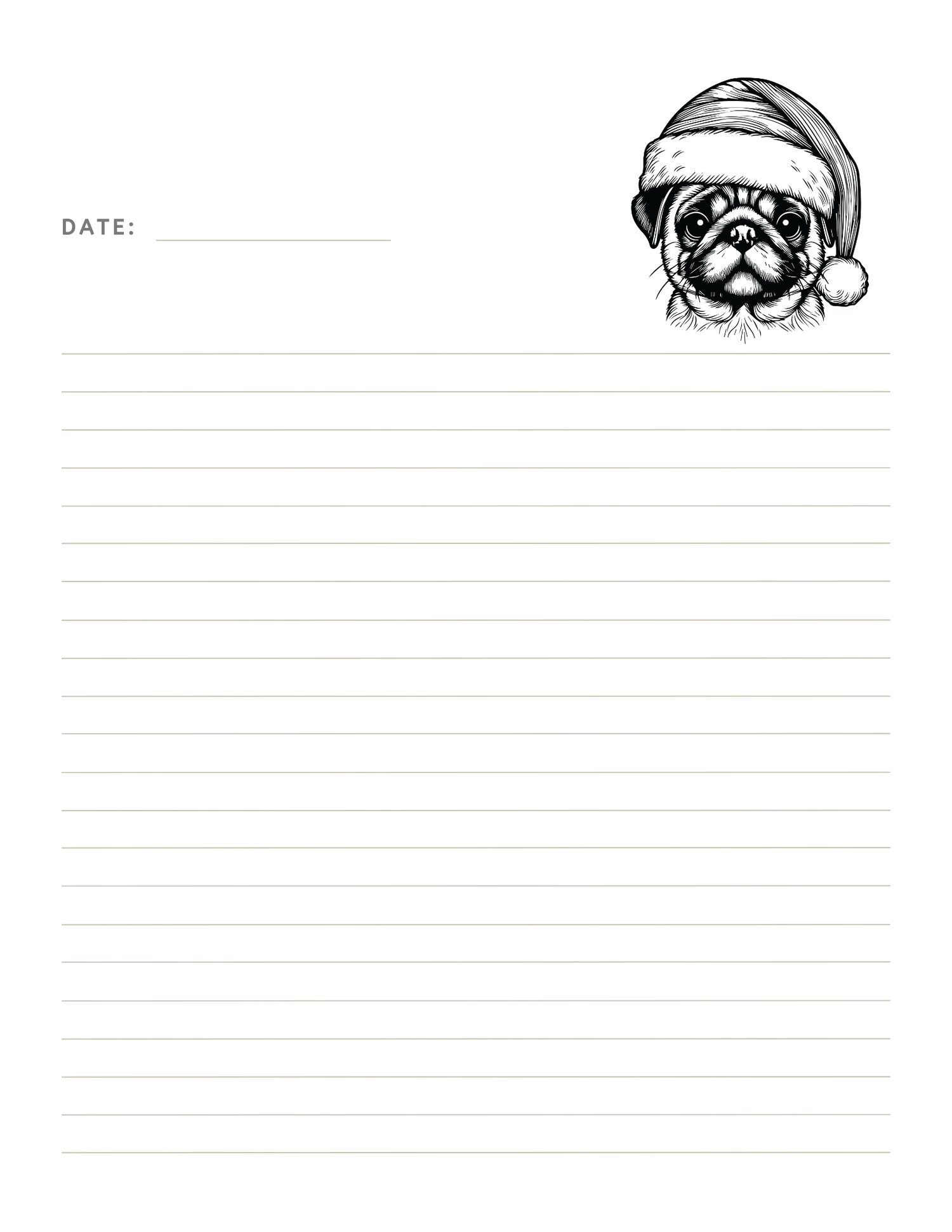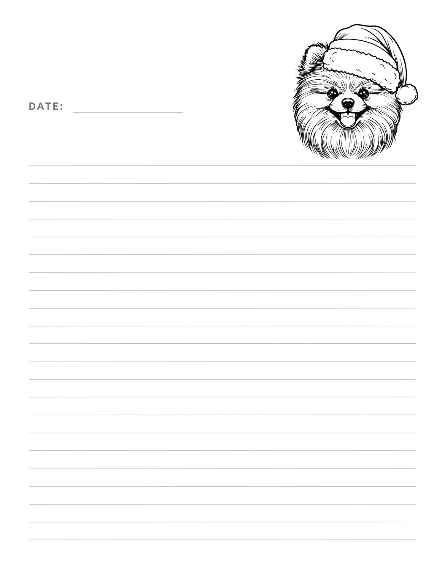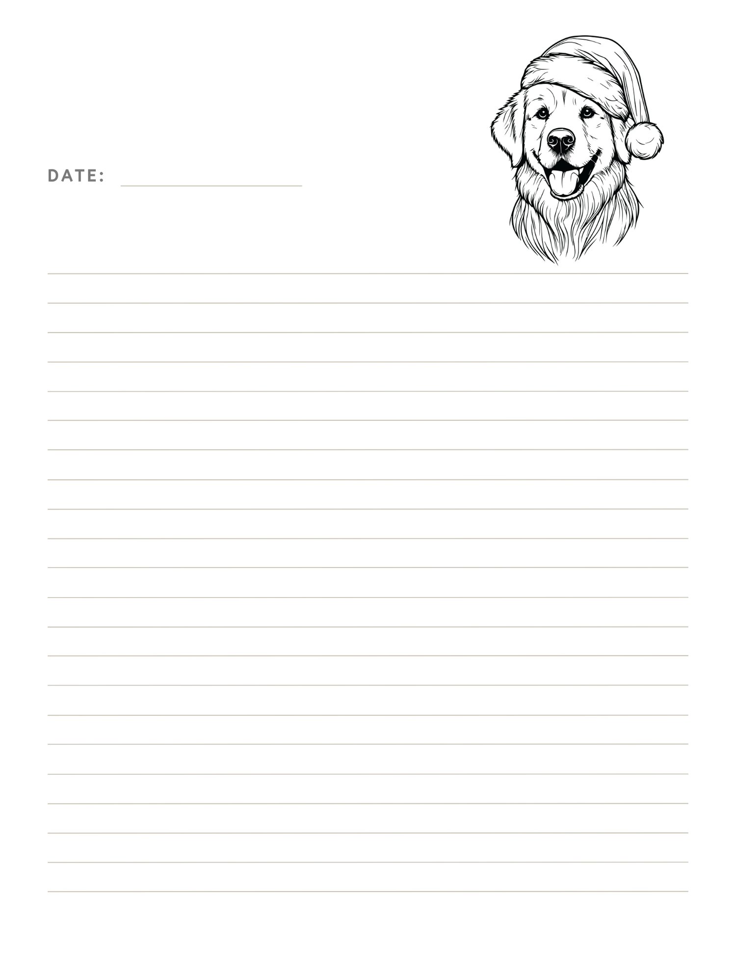 24 Adorable Dogs wearing Santa hats adorn 24 printable lined pages, and 24 unlined pages -