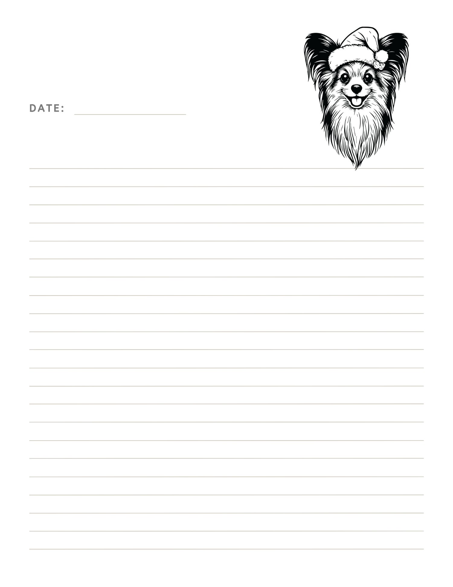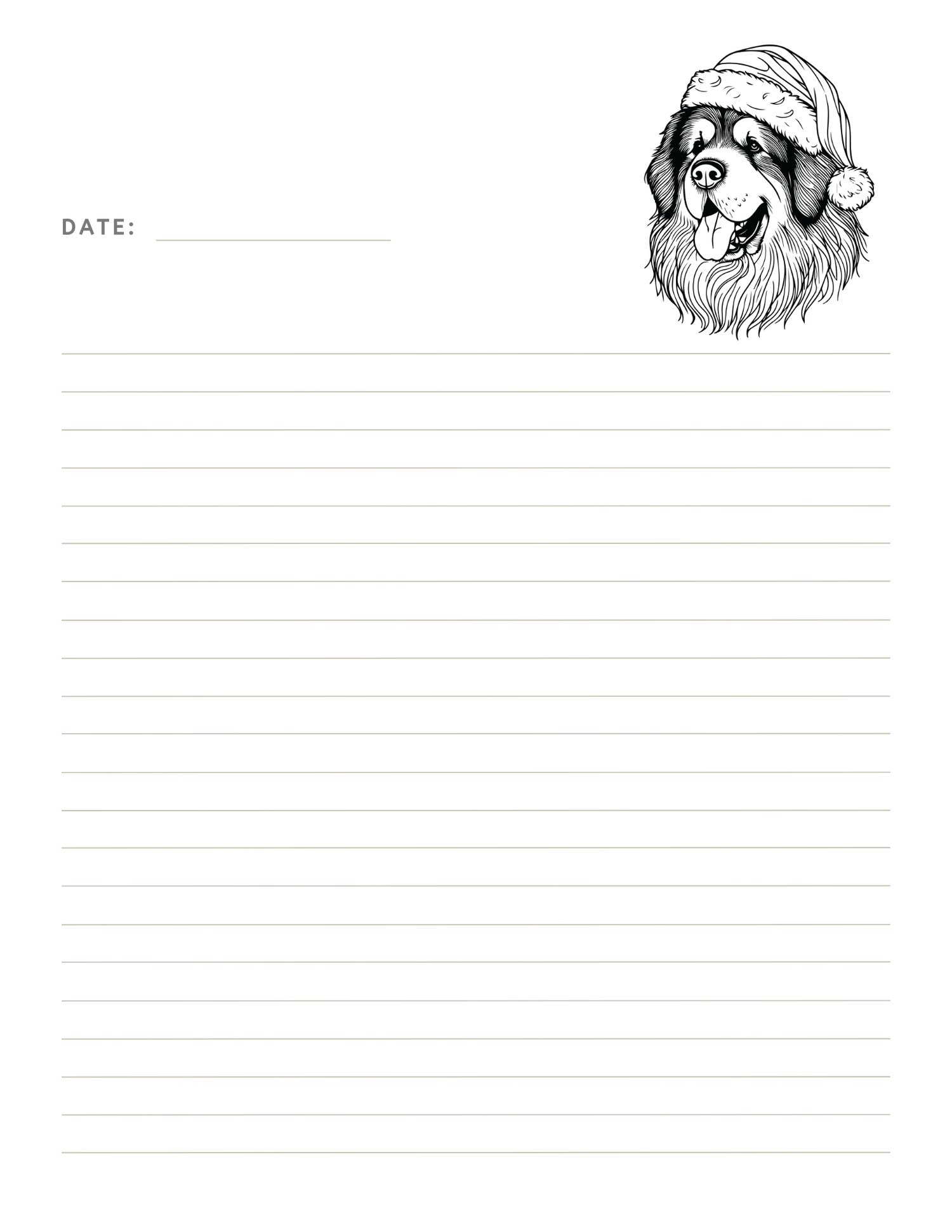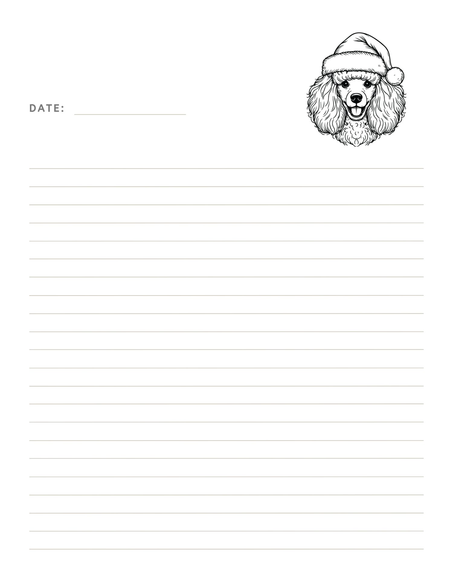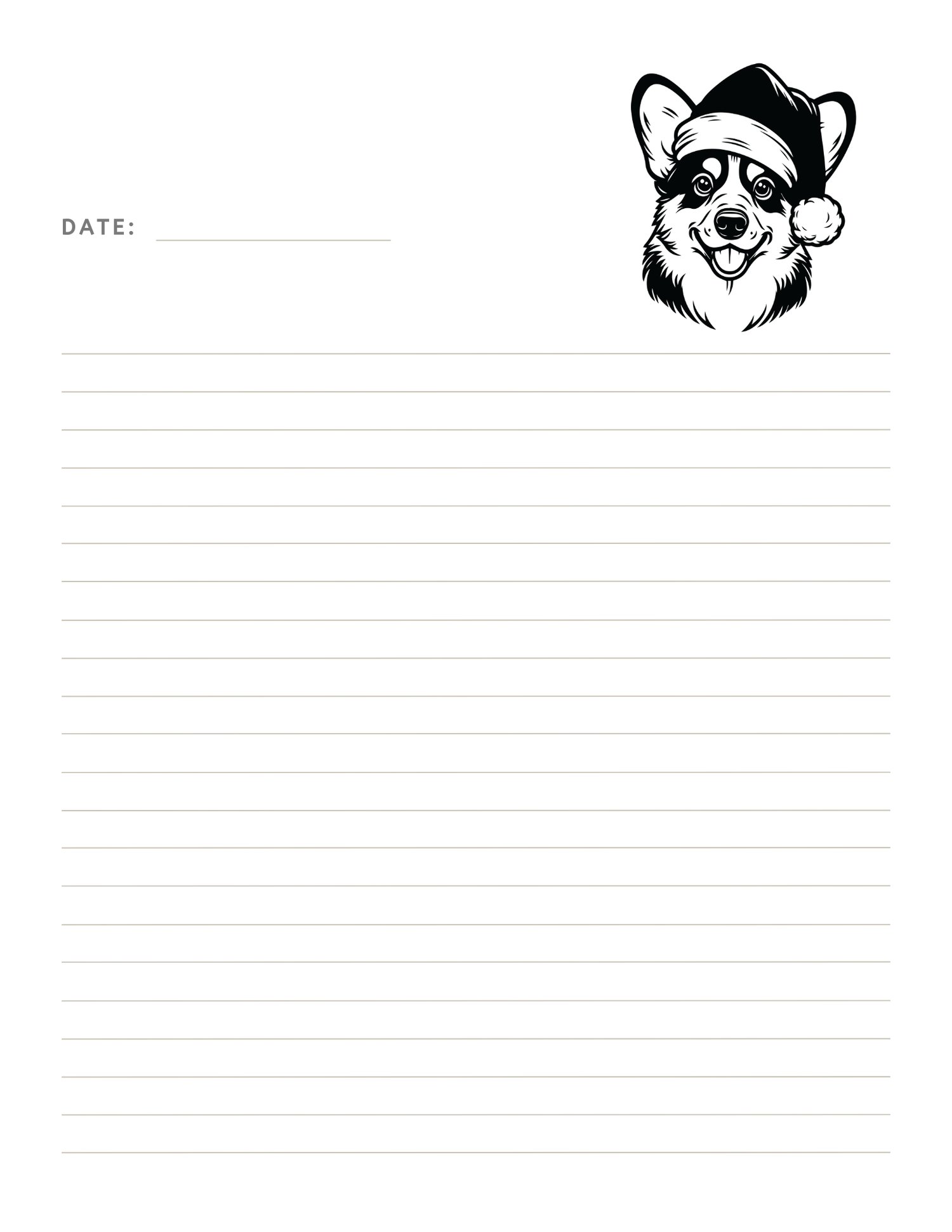 24 Adorable Dogs wearing Santa hats adorn 24 printable lined pages, and 24 unlined pages -