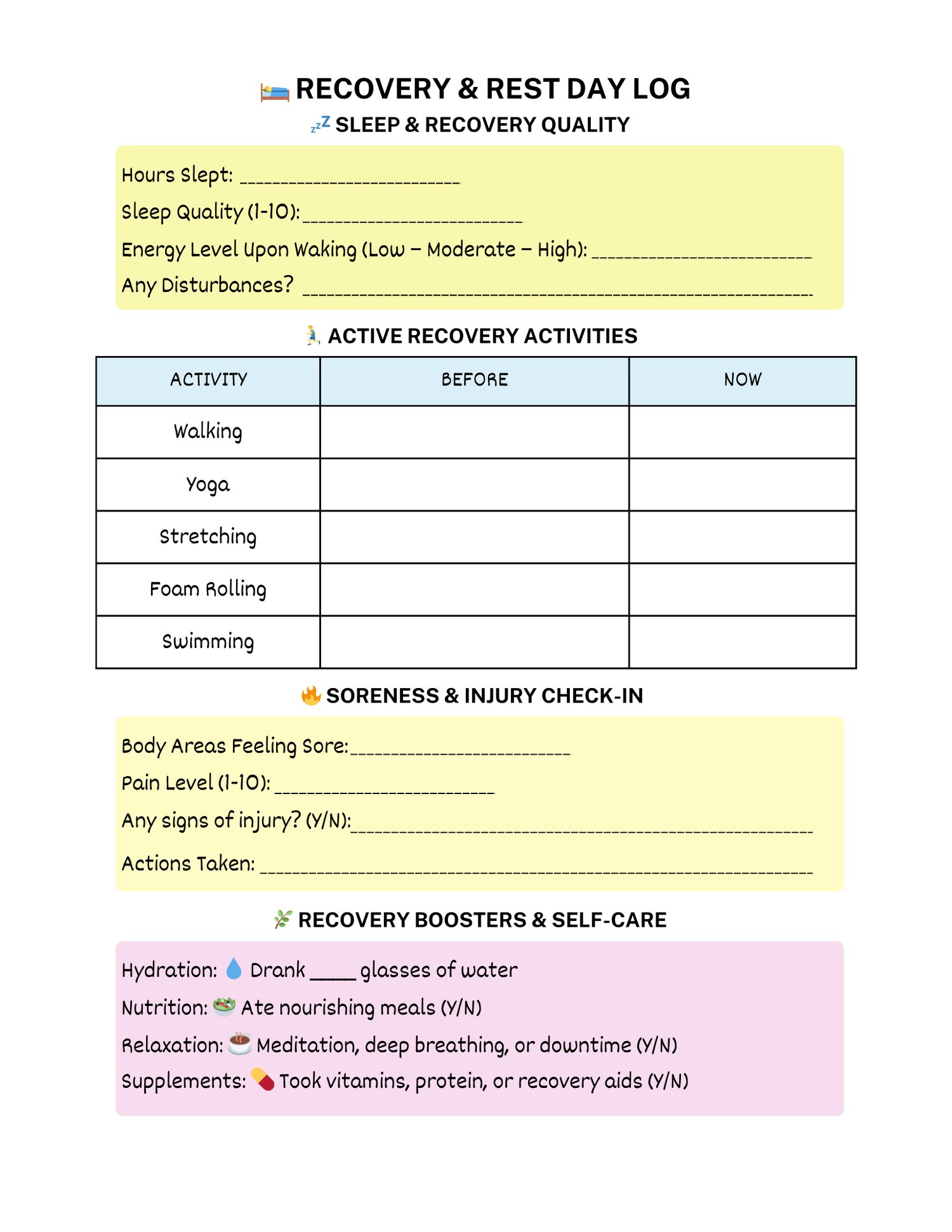 ✅ Recovery & Rest Day Log – Prioritize rest and track recovery for sustainable progress.