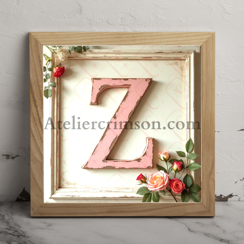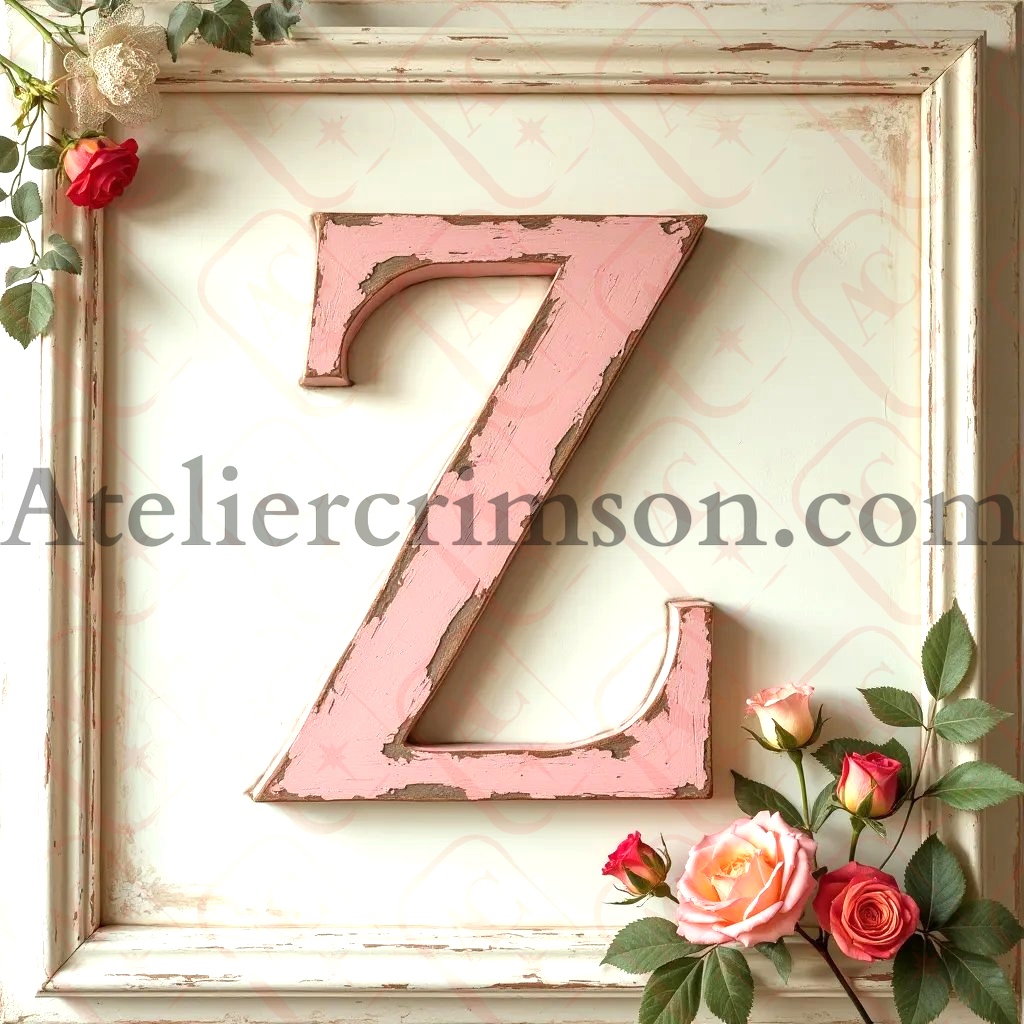 The letter Z pink and shabby chic This charming series presents the alphabet reimagined in a delightful shabby chic style. Each letter is crafted from weathered pink wood, standing proudly against a soft cream background. The collection exudes a romantic, vintage atmosphere with its elegant typography and subtle decorative elements.