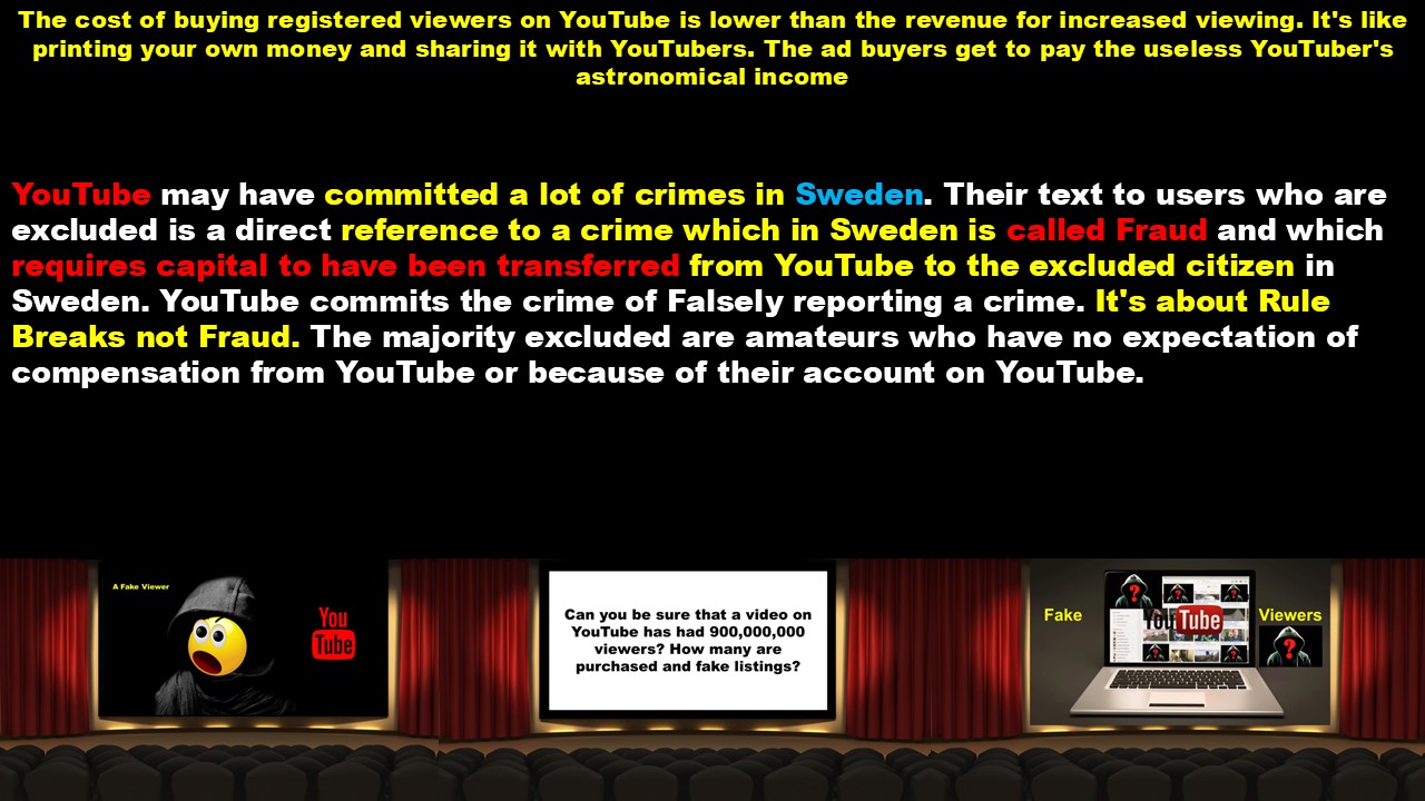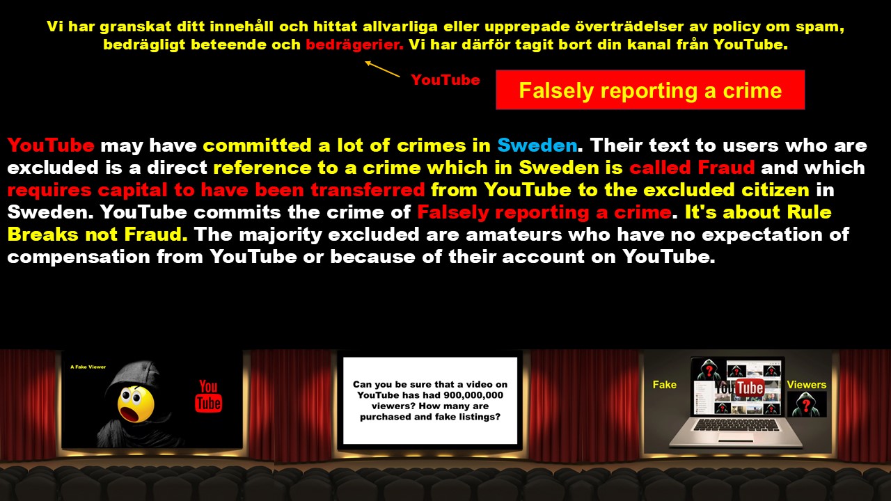 YouTube may have committed a lot of crimes in Sweden. Their text to users who are excluded is a direct reference to a crime which in Sweden is called Fraud and which requires capital to have been transferred from YouTube to the excluded citizen in Sweden. YouTube commits the crime of Falsely reporting a crime. It's about Rule Breaks not Fraud. The majority excluded are amateurs who have no expectation of compensation from YouTube or because of their account on YouTube.