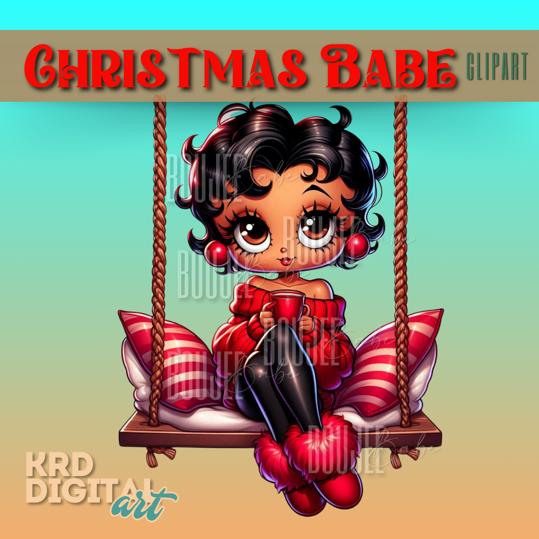 Add snug holiday vibes to your designs with this high-resolution PNG on a transparent background. The artwork features a big-eyed pin-up style holiday girl sitting on a rope swing with pillows, winter earrings, and a cozy drink. Drag-and-drop into Canva, Procreate, Photoshop, Cricut & Silhouette for boutique-worthy merch and engaging social posts.