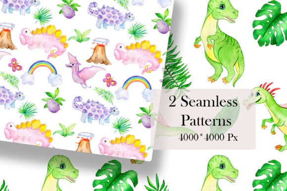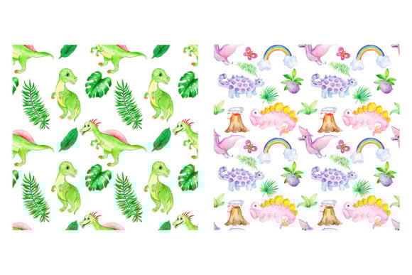 - 2 seamless dinosaur-themed watercolor patterns