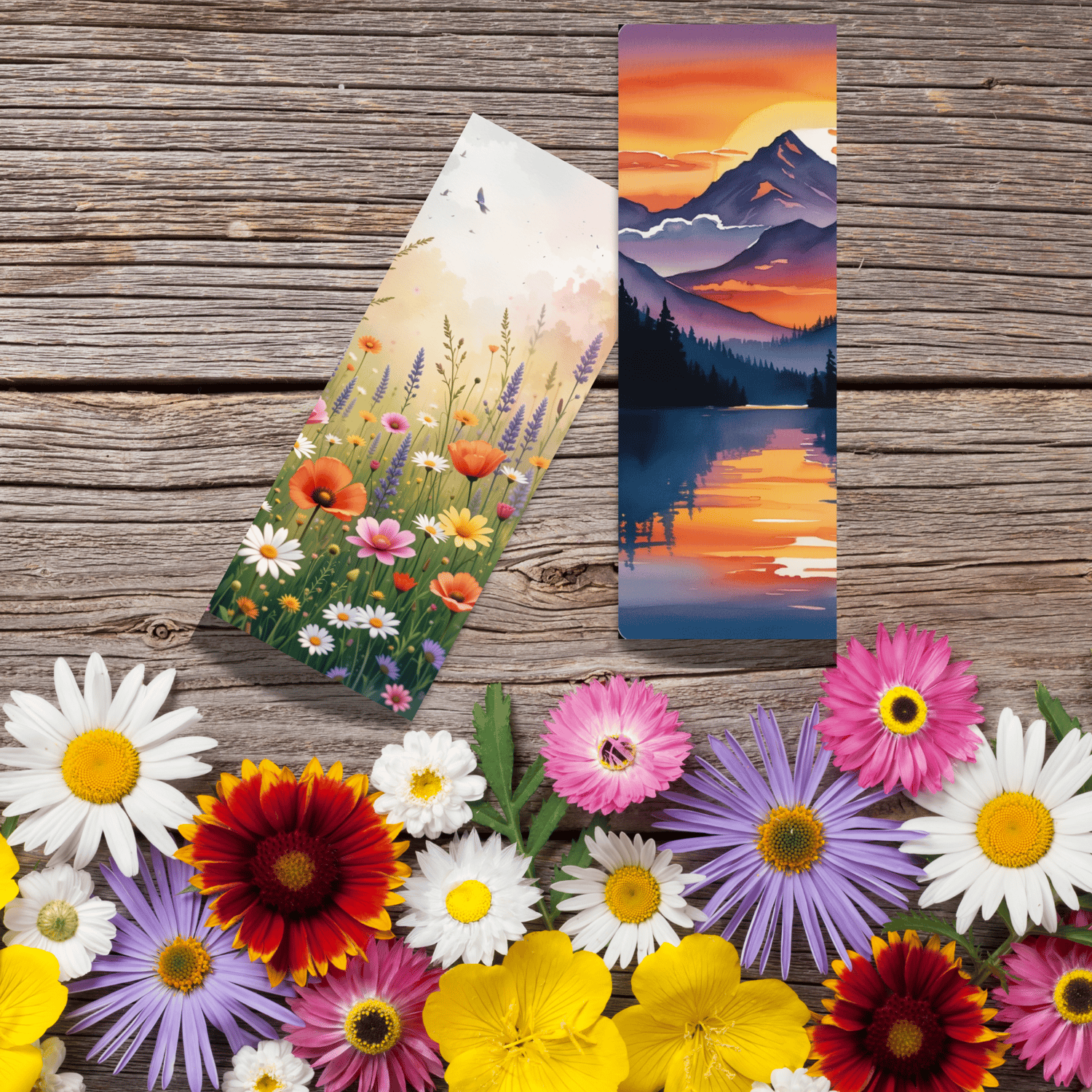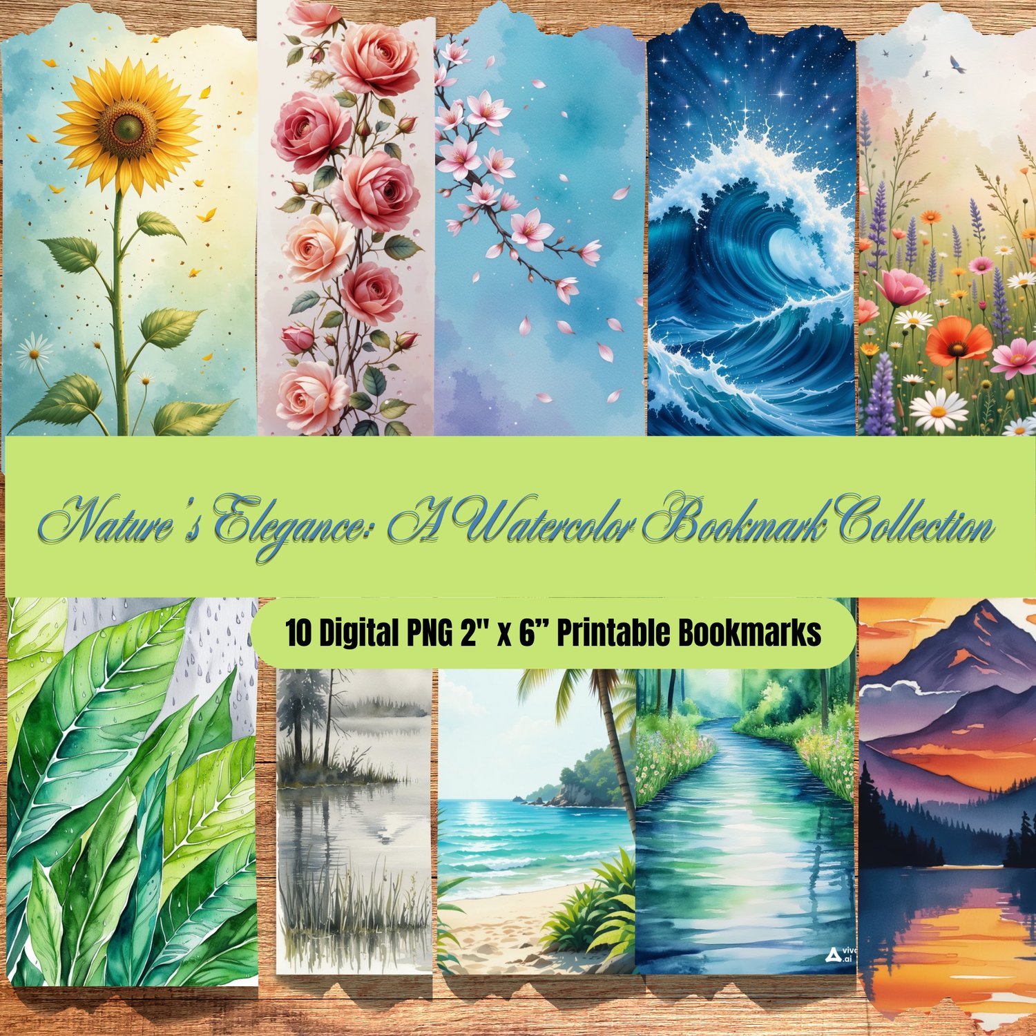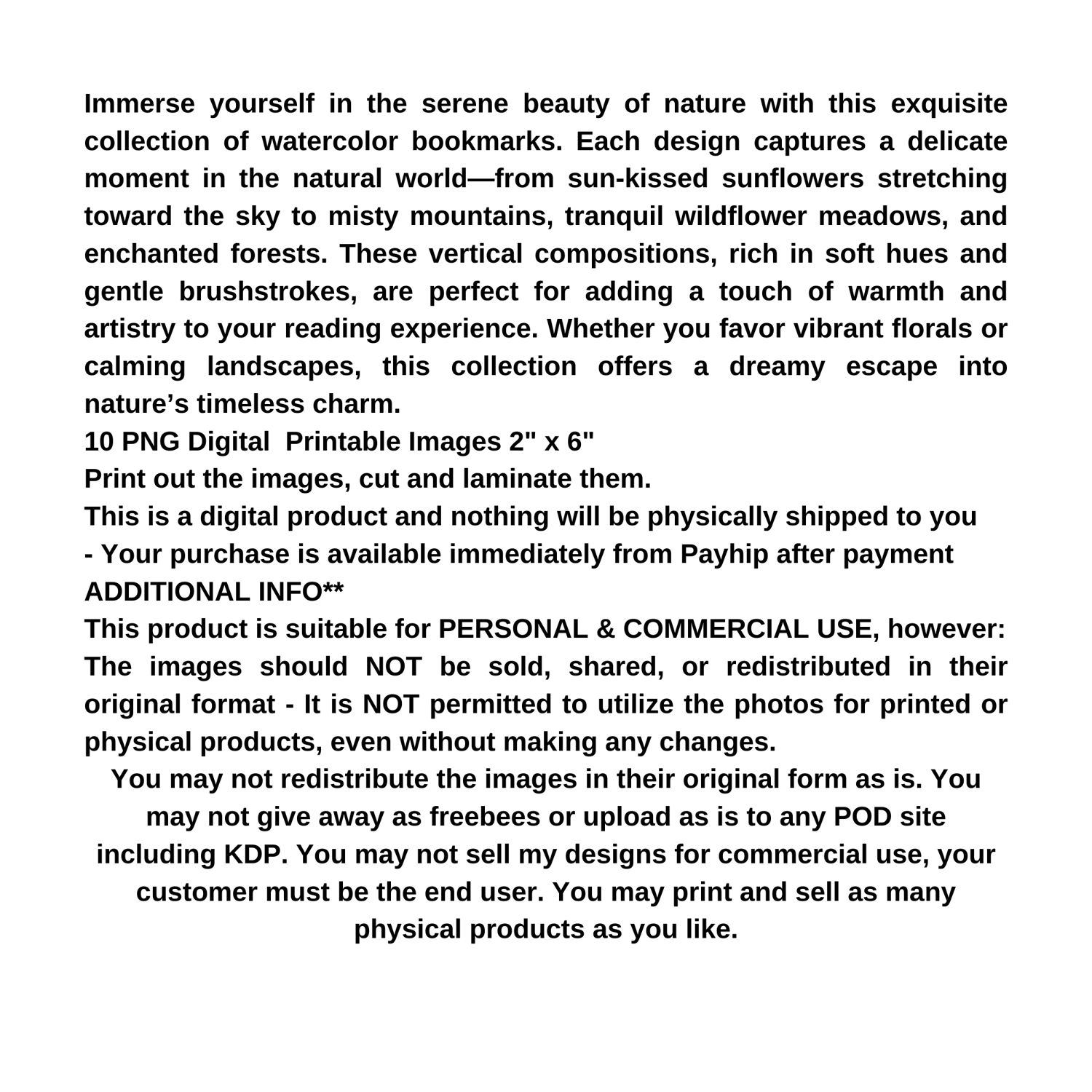 Immerse yourself in the serene beauty of nature with this exquisite collection of watercolor bookmarks. Each design captures a delicate moment in the natural world—from sun-kissed sunflowers stretching toward the sky to misty mountains, tranquil wildflower meadows, and enchanted forests. These vertical compositions, rich in soft hues and gentle brushstrokes, are perfect for adding a touch of warmth and artistry to your reading experience. Whether you favor vibrant florals or calming landscapes, this collection offers a dreamy escape into nature’s timeless charm.