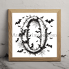 Number 0 coloring book halloween occupying 90% of a 1024x1024 image. Use an Old English font style with clear outlines resembling a coloring book page. The character is composed of intricate bat silhouettes, creating a spooky Halloween atmosphere. Use only pure black (#000000) for the character and outlines, and white for the background.2D, black and white style resembling a high-quality adult coloring book page.