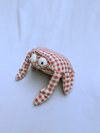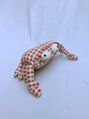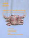 This one-of-a-kind crab is made of 100% upcycled fabric, in this case a smooth cotton with a pattern of red, green, and pink gingham, with white cotton for the eyes. (The pupils are made of felt, and handsewn, not embroidered.) Each one is unique--no exact colour combination is repeated and there are only limited amounts of each upcycled fabric in any case--and has its own personality. The crabs are about 16" / 40cm from claw to claw, with the bodies being roughly 7" x 8" x 3" (17cm x 20cm x 8cm).