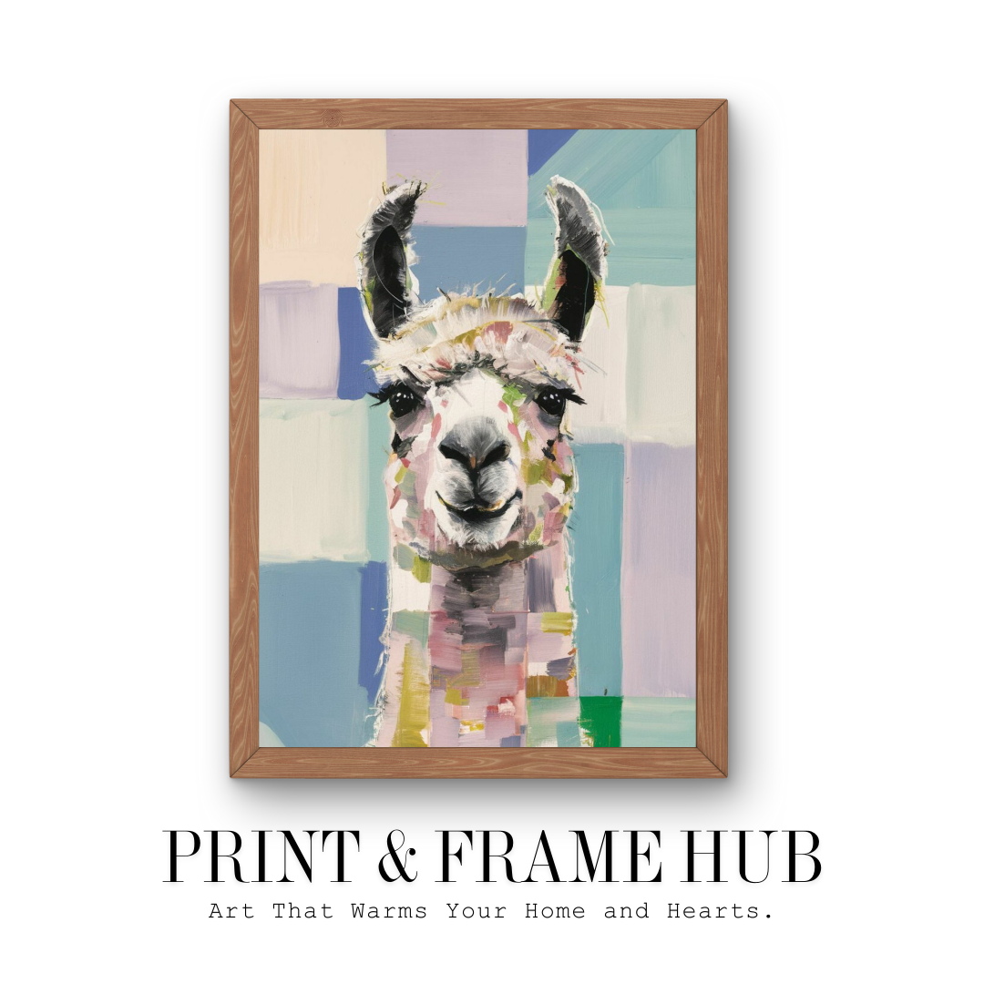 This vibrant painting features a cheerful llama against a pastel patchwork background. Bold brushstrokes and playful colors capture the llama's lively expression, creating a joyful, whimsical scene. Perfect for adding fun and brightness to any home, this artwork brings charm and delight to any room. Ideal for animal lovers and those who appreciate colorful decor, it's a standout piece for any wall.