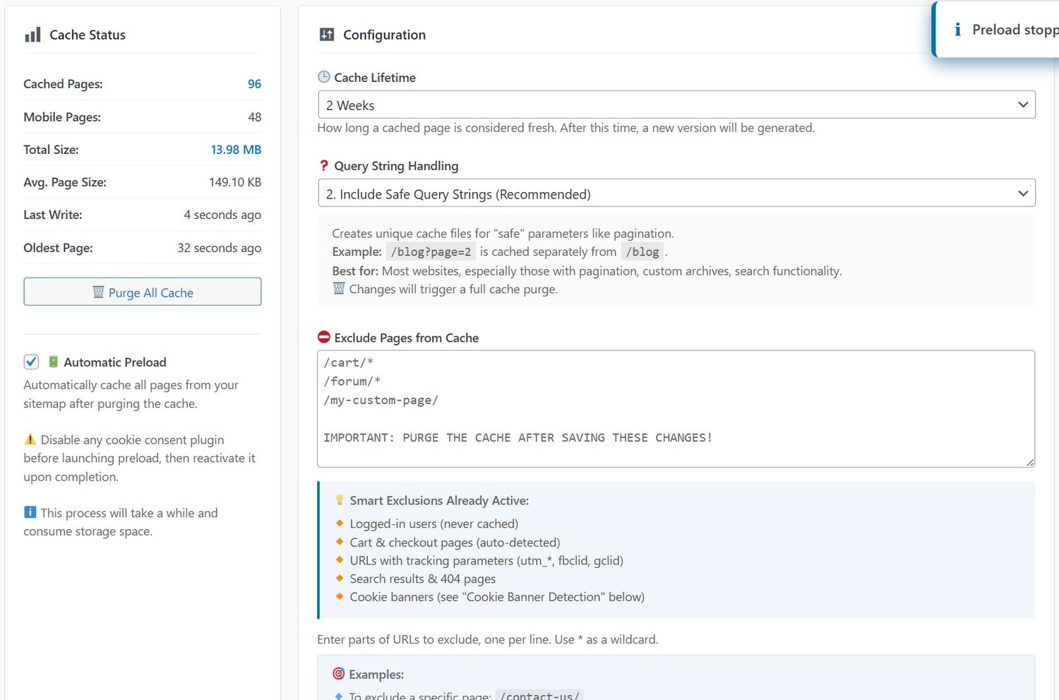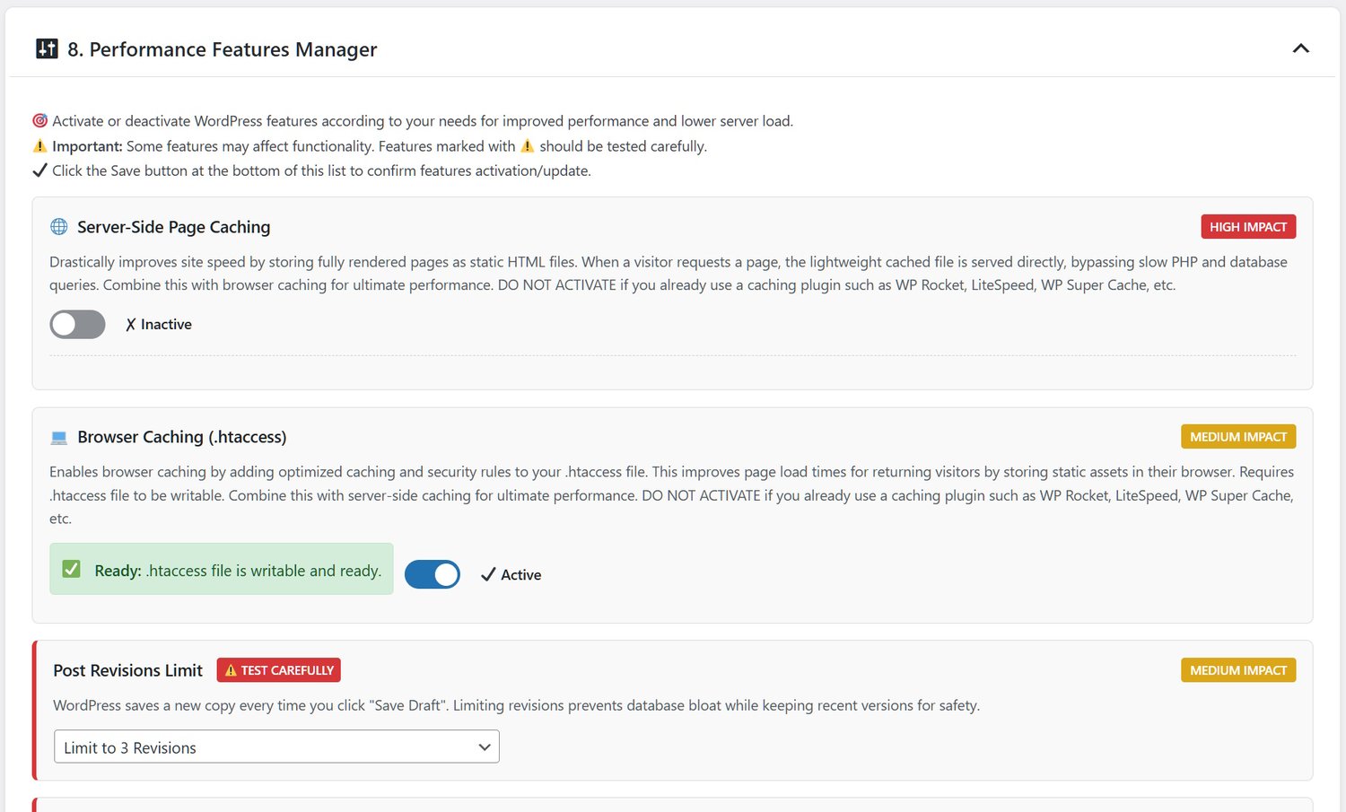 The plugin offers a range of performance-enhancing features in the fine-tuning section to speed up your siteโs loading time. These include a dual caching system that relies upon both the server and the browser, along with the ability to remove unused WordPress components.
