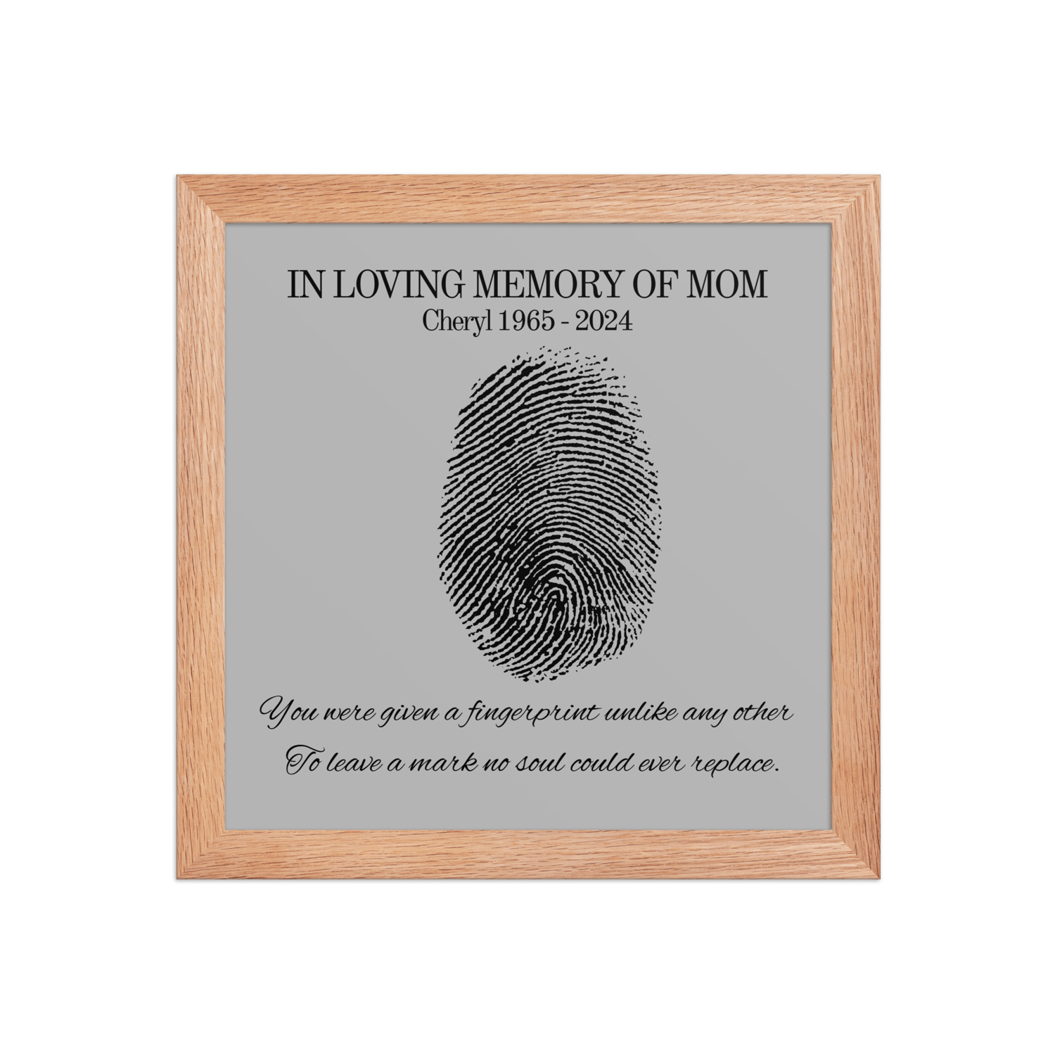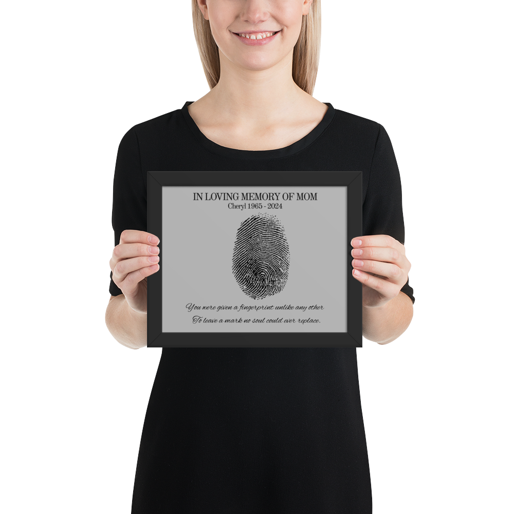 Designed to bring comfort during grief, this custom design features your loved one’s name and dates beneath a fingerprint illustration — a powerful symbol of their unique impact on your life.