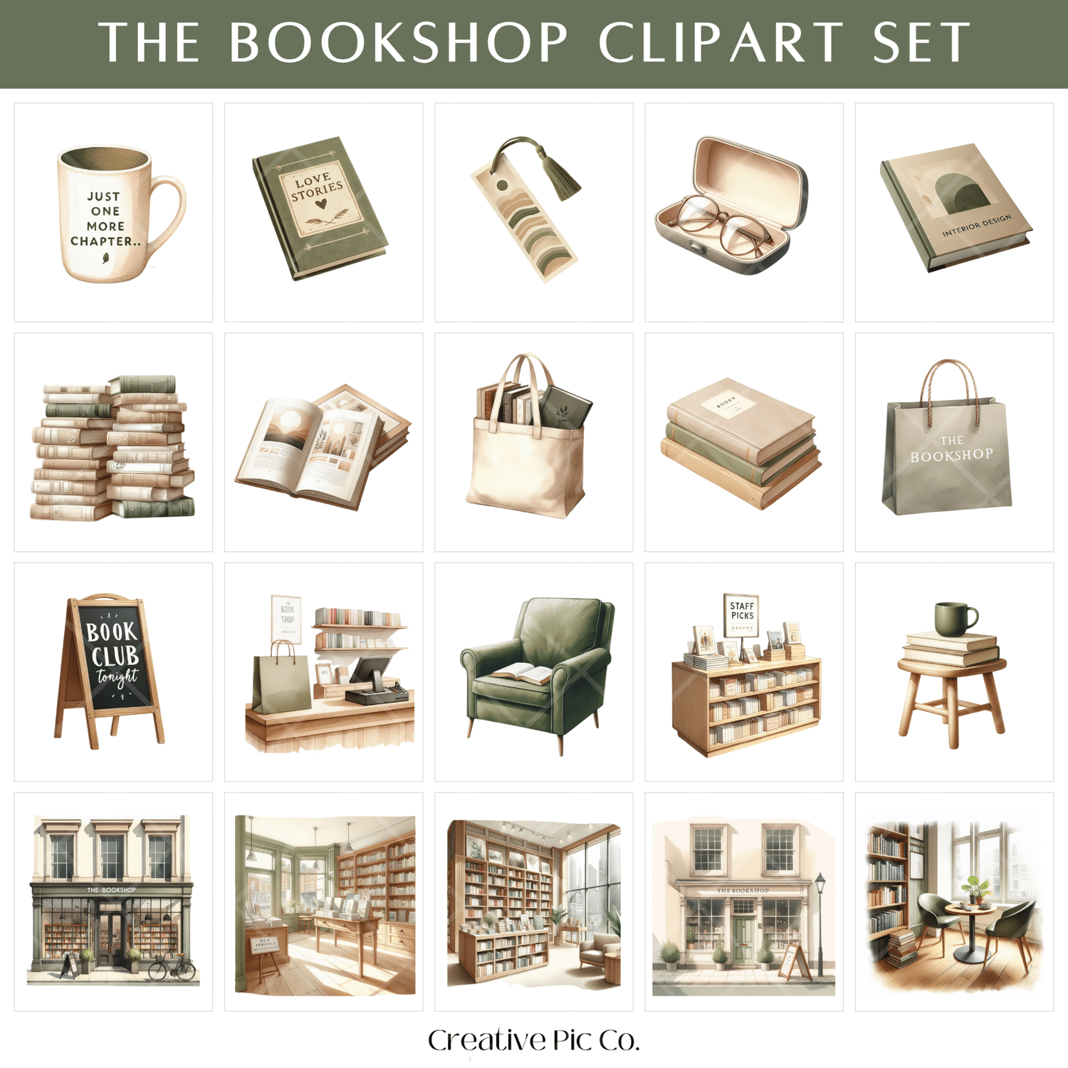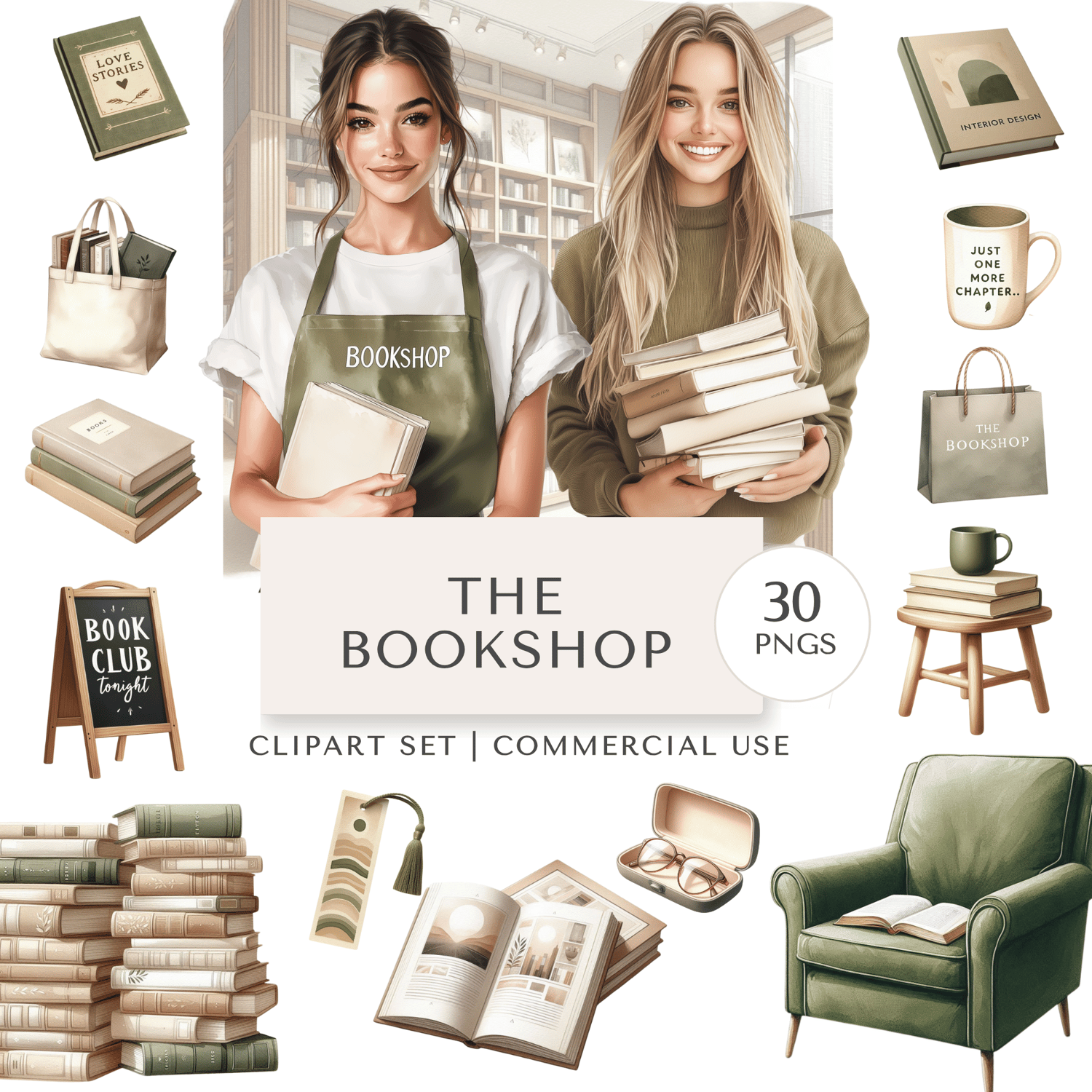 Step into a world of calm and creativity with The Bookshop Clipart Set. This 30 piece collection includes illustrated books, reading girls, glasses, coffee mugs, interiors, and literary-themed accessories all with transparent backgrounds.