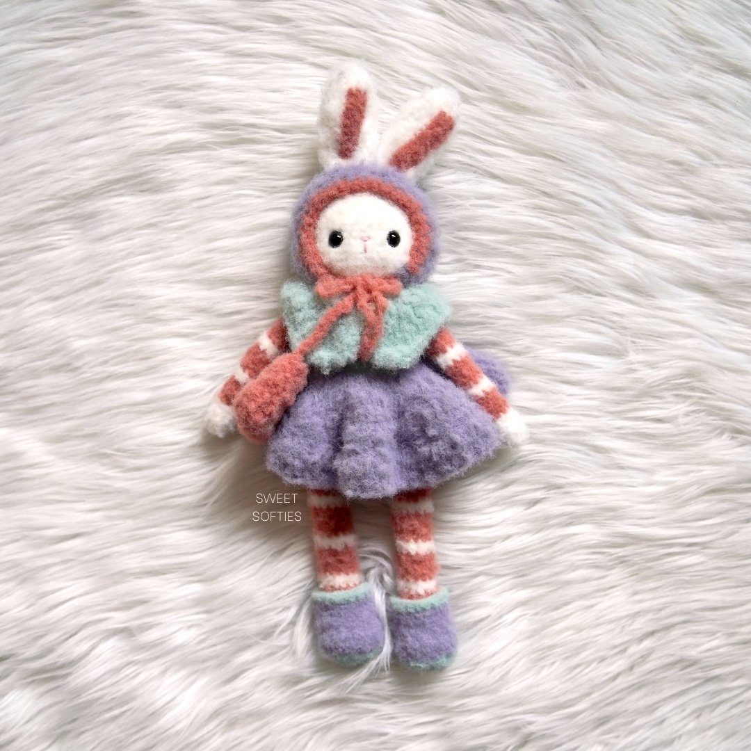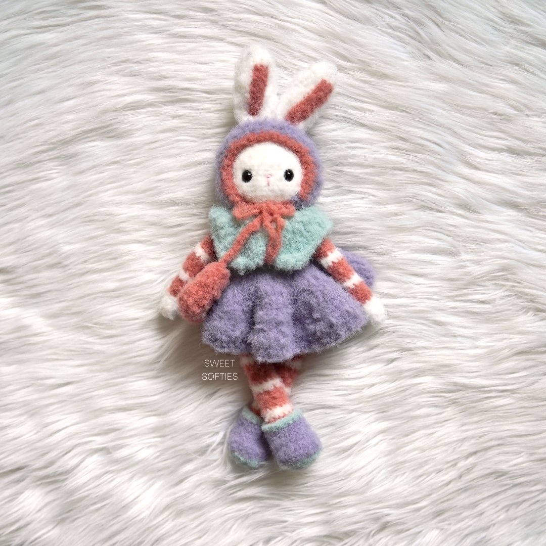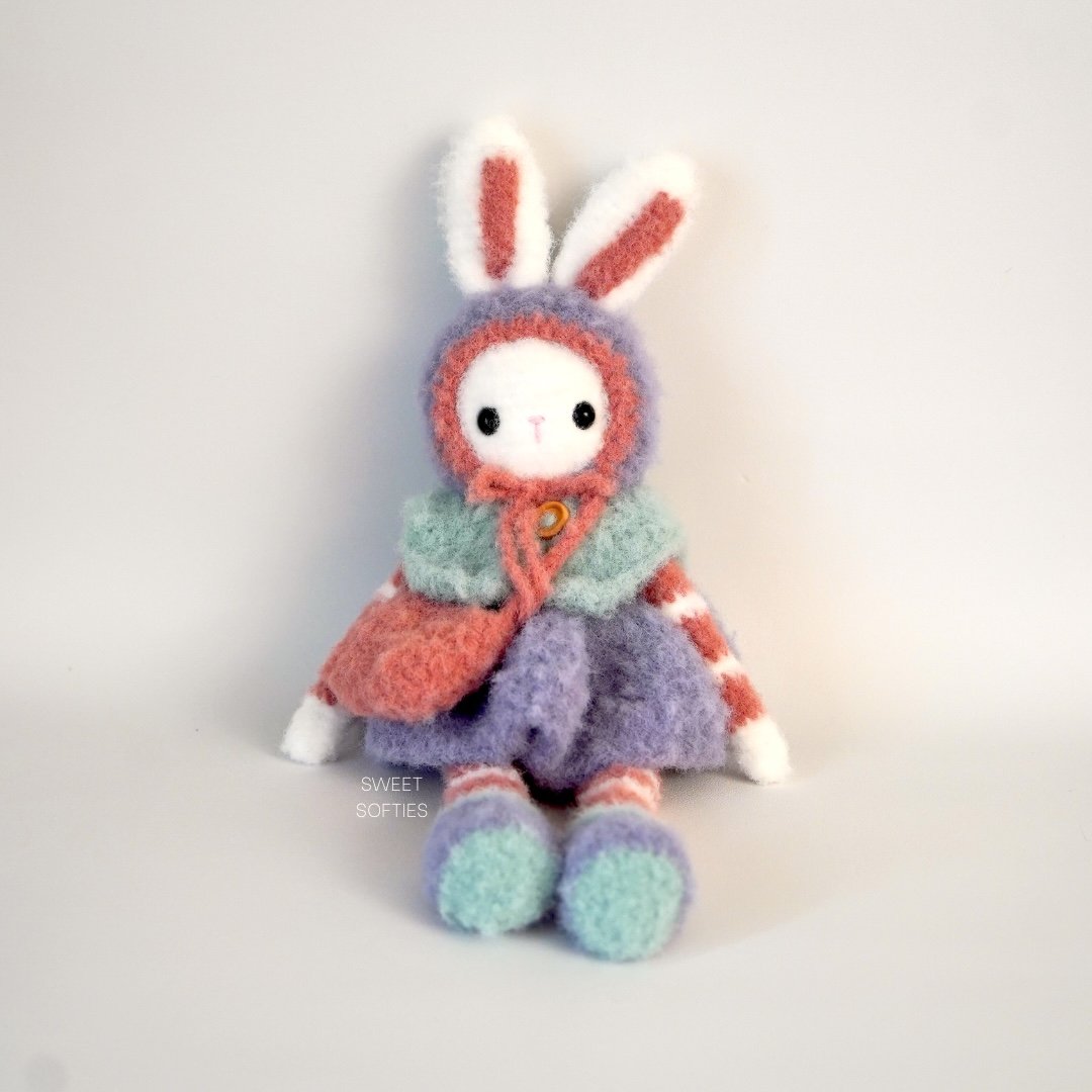 Snowdrop Fluffykins is a large bunny amigurumi with removable clothing and accessories. She has a bonnet with ear holes, buttoned shawl, dress skirt, boots, and crossbody bag. All dress-up items are crocheted in one piece, and this pattern is almost completely no-sew! The only sewing required is to attach Snowdrop’s ears to her head.