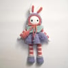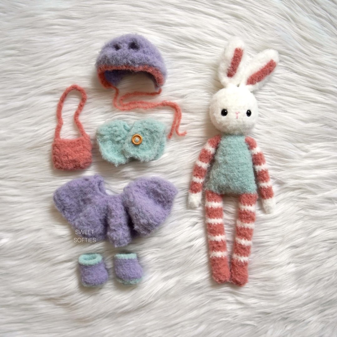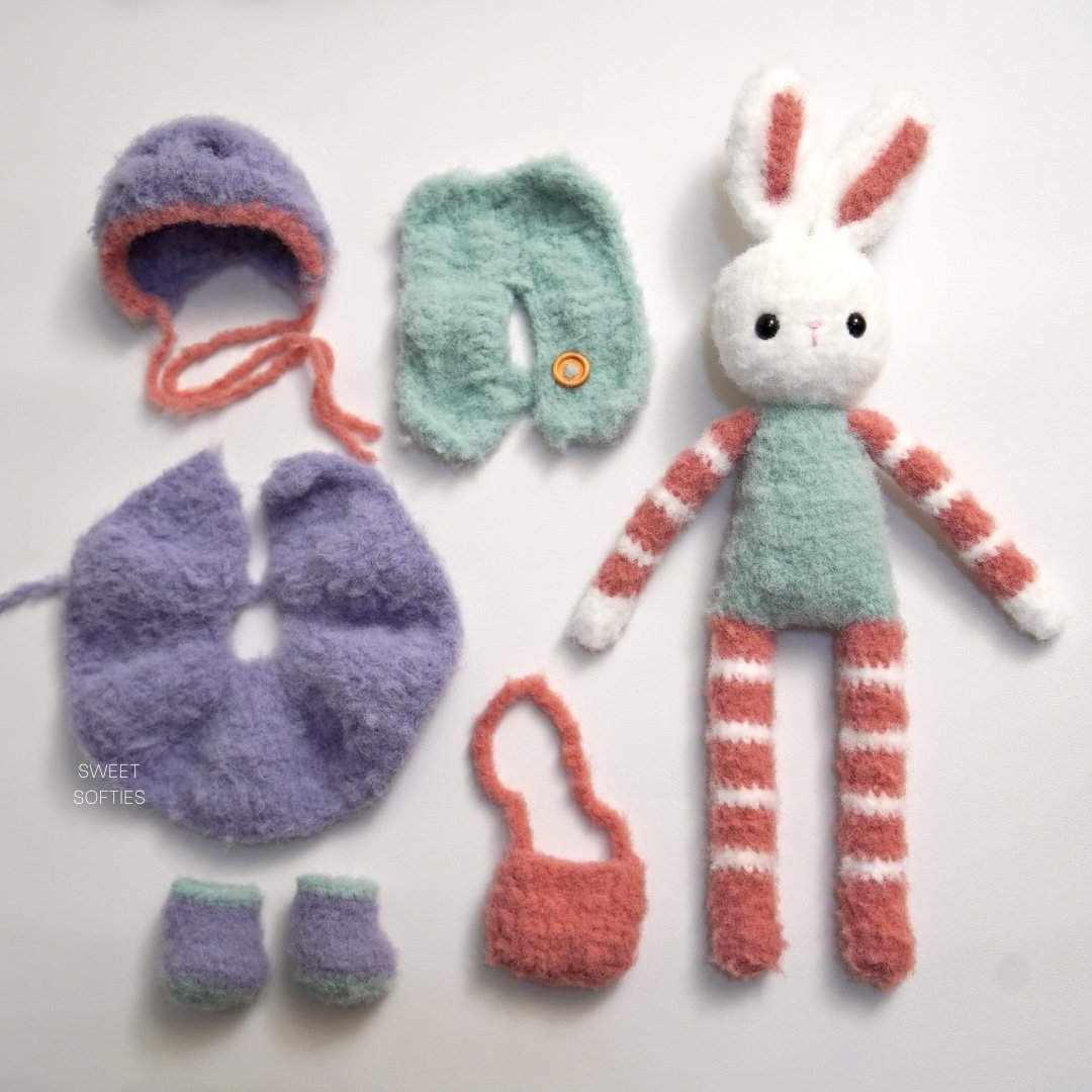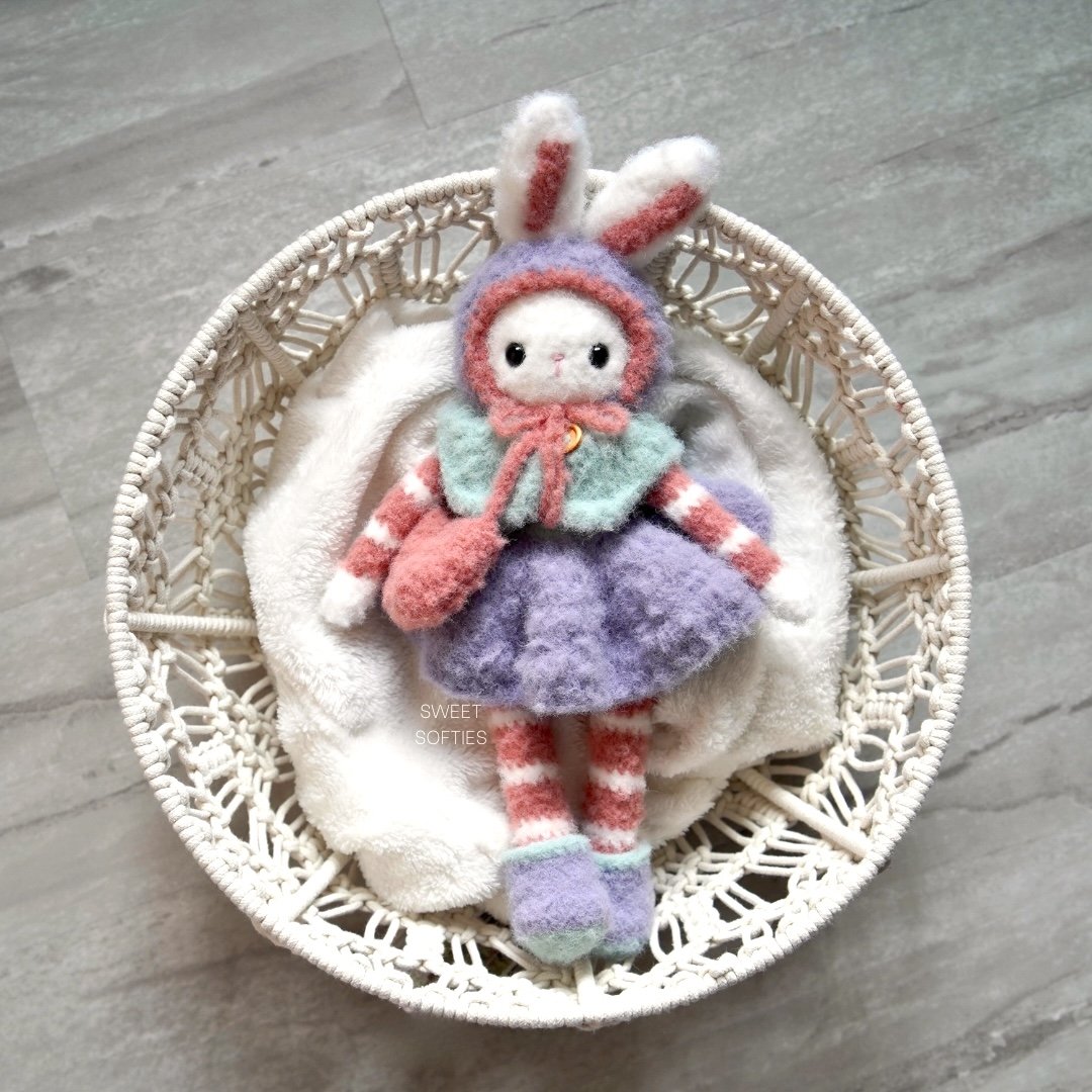 Snowdrop Fluffykins is a large bunny amigurumi with removable clothing and accessories. She has a bonnet with ear holes, buttoned shawl, dress skirt, boots, and crossbody bag. All dress-up items are crocheted in one piece, and this pattern is almost completely no-sew! The only sewing required is to attach Snowdrop’s ears to her head.