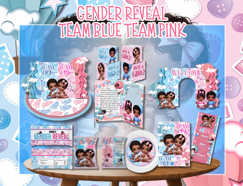 Add excitement to your gender reveal party with this fun, interactive bundle! Featuring playful blue and pink graphics, this set is perfect for Team Blue vs. Team Pink themes.
