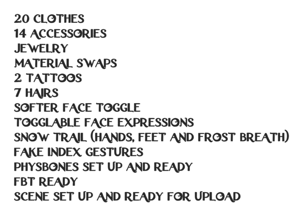 - Color swaps for Body ( left and right Hair color, Hair saturation, Hair Brightness, Hair hue, Left and right eyes color swap, Eye saturation, Eye brightness, Skin tone, Tattoos, Tattoo emission hue, Brows color, Nail color) Clothes ( Fur Puffer to black, Jackets, Sweaters, Skin shirt & Tank, Fishnets solid, Fishnet crop, Fishnet white, Bottoms, Boxers, Shoes, Socks to black) Accessories (Stickers, Gloves, Bow, Bunny bag, All white, Mask, Santa hat, Scarf, ear warmers) Silver to gold, All red hue, Christmas lights.