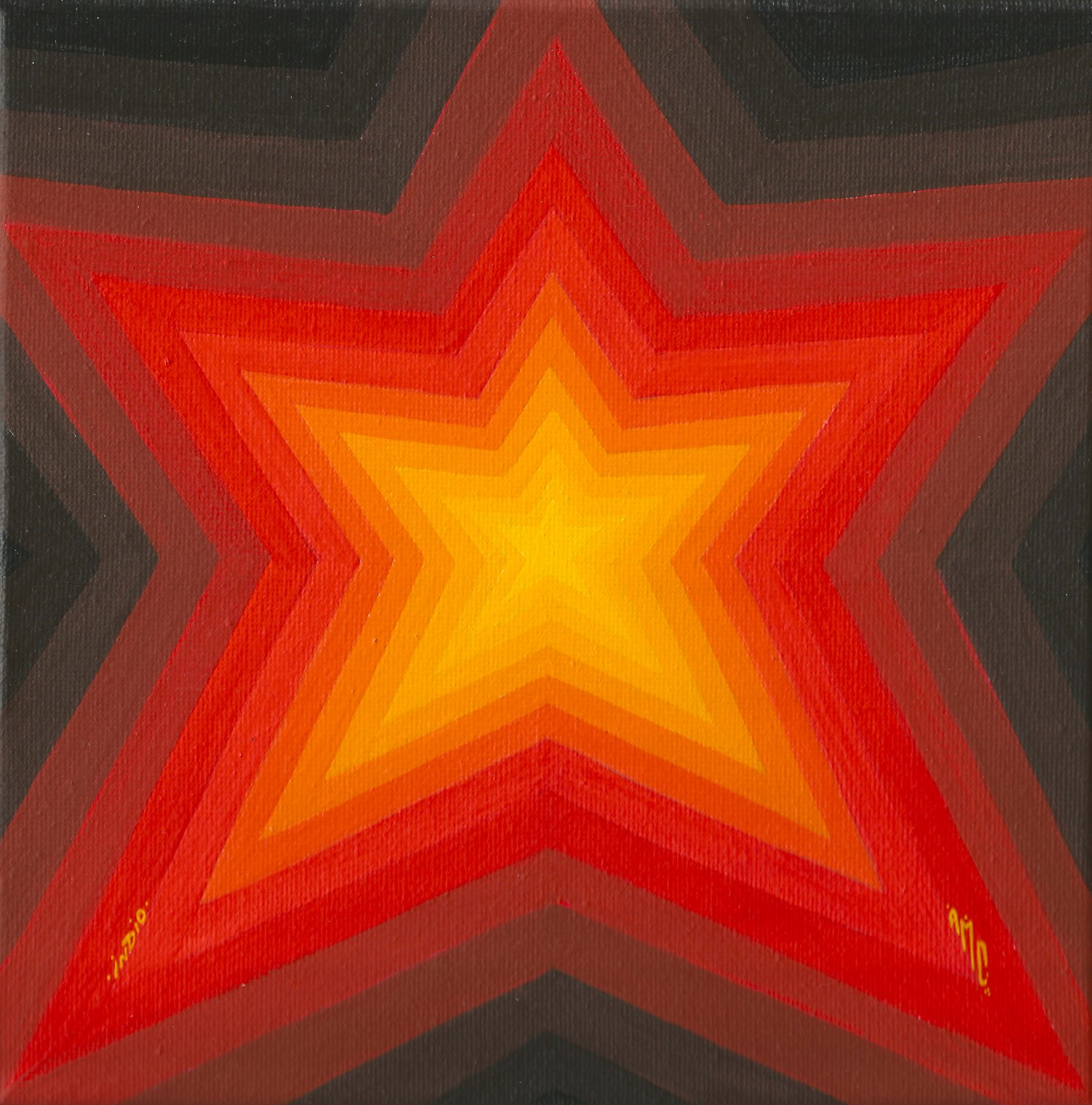 Estrella del latín Stella y éste del protoindoeuropeo Strelea, Lamat en Maya, Citlali en Náhuatl. Chispa, brillo de lo no manifestado, compañía del silencio, ancestros siempre vivos, líneas de tiempo paralelas, reflejos de nuestra innegable eternidad. Brazos, piernas abiertas, apertura de la cabeza y el corazón simpre ardiente con el motor del propósito divino, que se cumple sí o sí, dentro de éste sueño nuestro, venir a ser materia, el descanso y recreación cíclica de ser dioses, orquestándonos en la ilusión del error, del miedo, de la mortalidad, sólo para recordar qué siente éso, nacer, crecer, vivir, ser otra vez, por siempre. Acrílico en canvas de 20x20cm, Curridabat, Costa Rica, 15 de Julio, 2024.