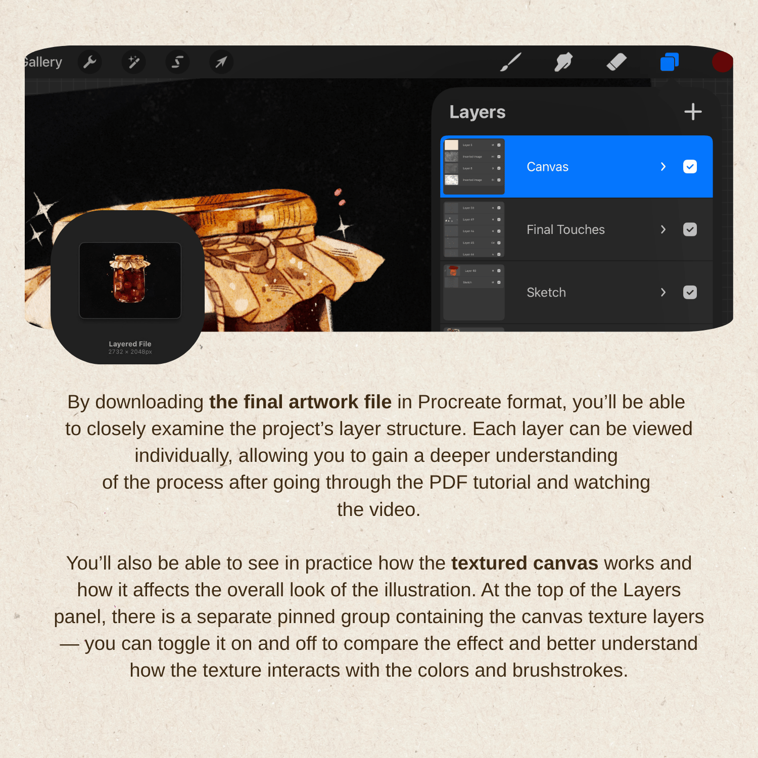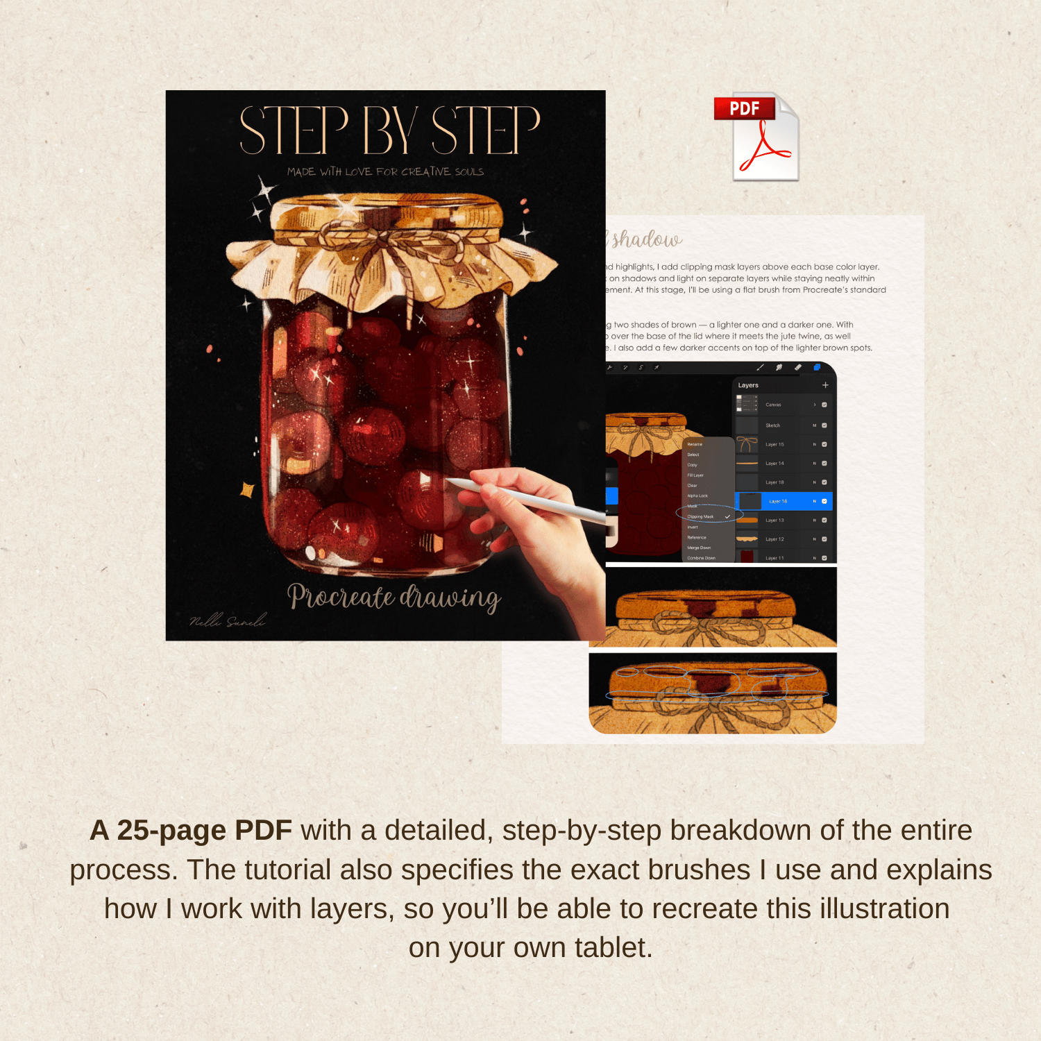 This tutorial walks you through the entire process of creating the "Jam Jar" illustration — from the first sketch to the final highlights. Every layer, every decision, every technique explained in detail.