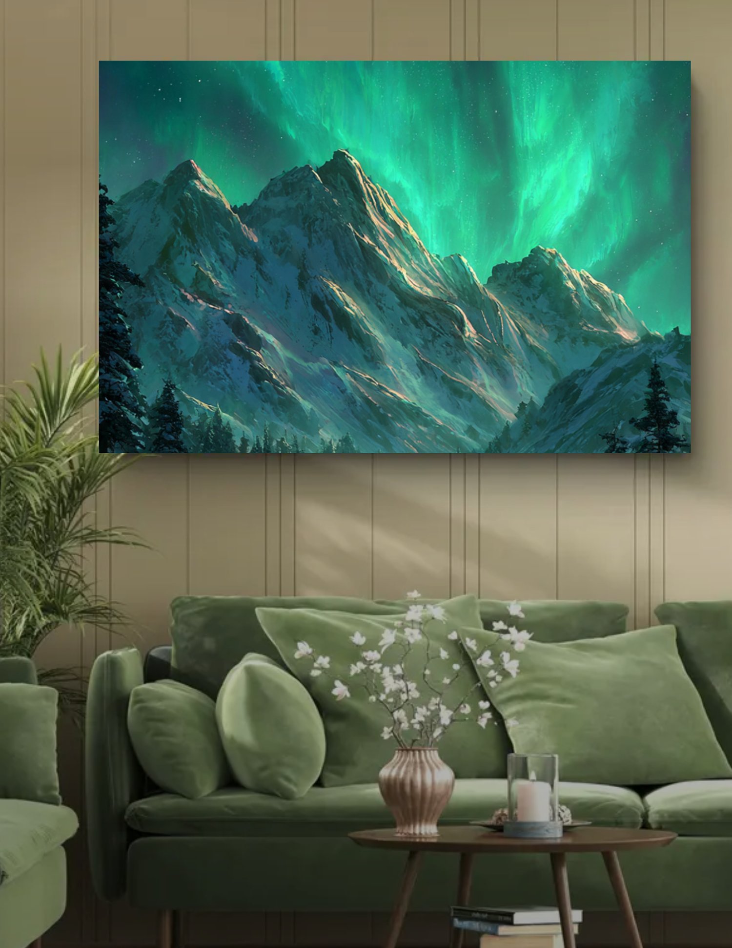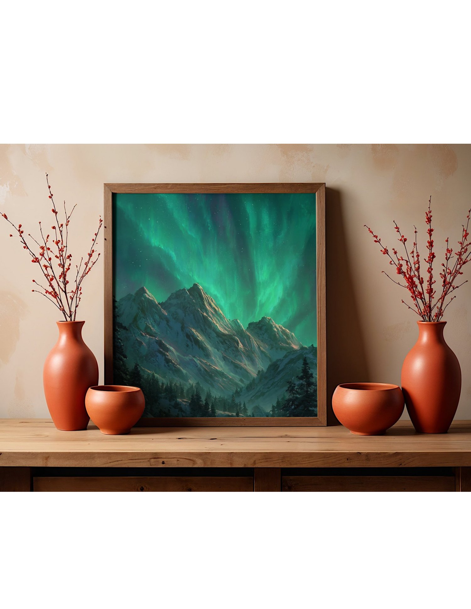 Northern lights wall art, Aurora Borealis mountain painting, emerald green landscape decor, snow capped peaks art, Arctic nature print, vibrant mountain scenery, night sky wall decor, turquoise aurora illustration, winter wilderness art, majestic mountain