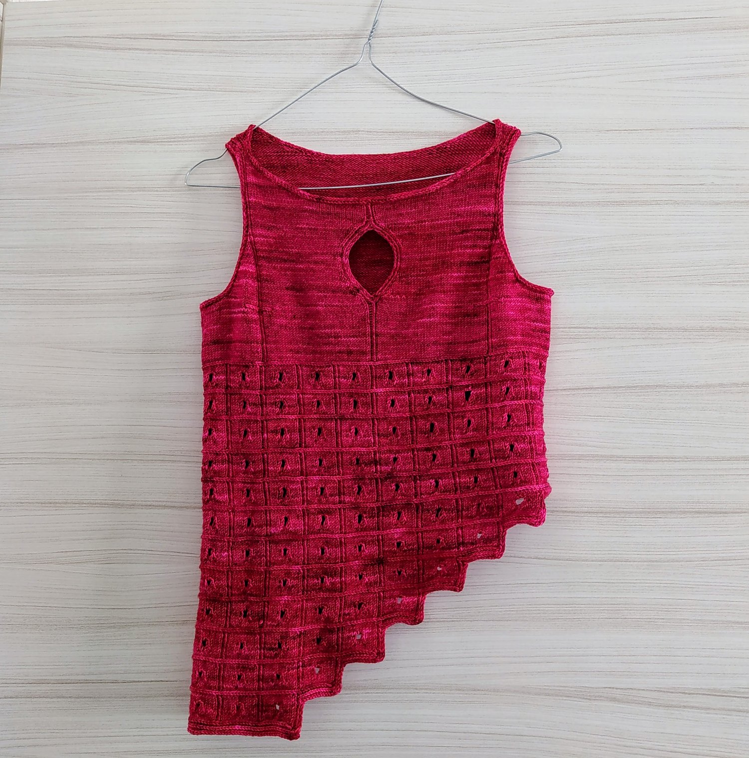 At the underarms, the front and the back are joined and the top is worked in the round until the hem, at first in stockinette stitch (interrupted by simple twisted vertical lines), then in a fun stitch pattern with big holes, resembling the pattern visible in the character top in the manga illustrations.