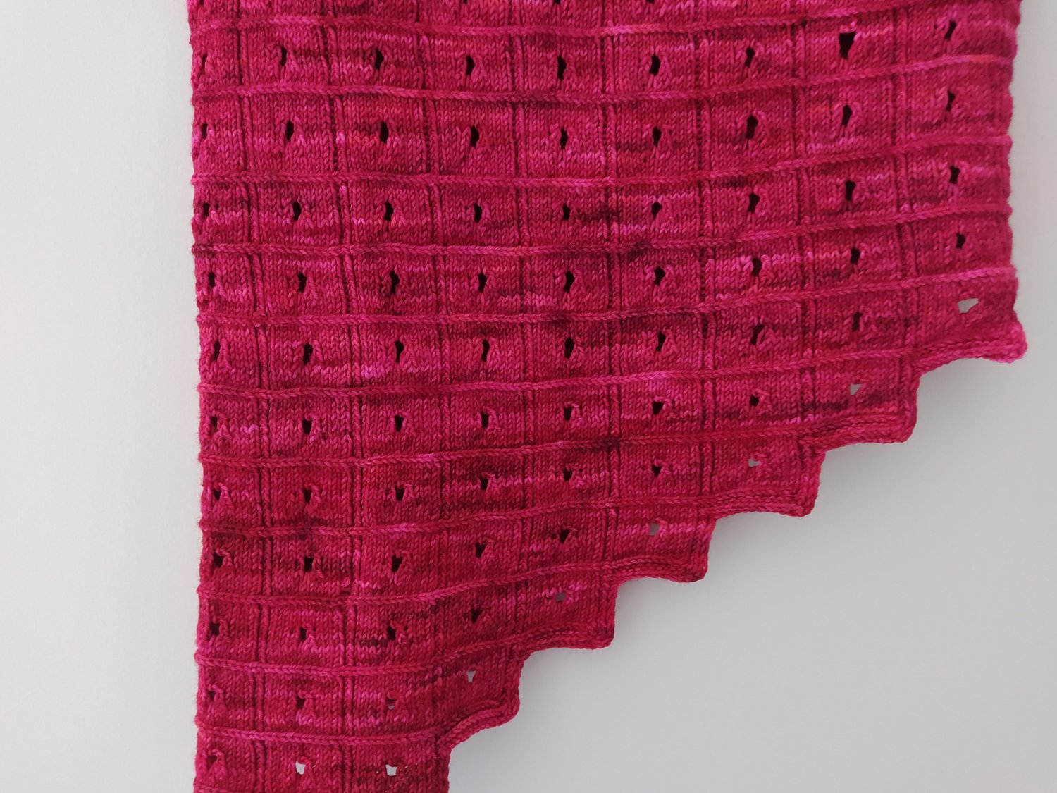 The asymmetrically scalloped edge adds movement and interest to the pattern, but it is also possible to work simply a split hem, if preferred.