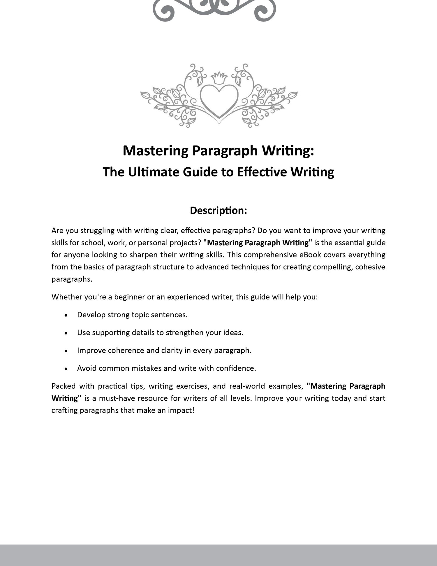 Do you struggle to write paragraphs that are effective and clear? Do you need to write better for work, school, or personal projects? Anyone who wants to improve their writing skills should read "Mastering Paragraph Writing." This comprehensive eBook covers everything from the basics of paragraph structure to advanced techniques for creating compelling, cohesive paragraphs.