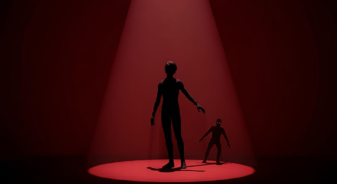 Shadow’s Stage is a haunting digital artwork that captures the tension between light and darkness. A lone figure stands under a piercing red spotlight, with a smaller, eerie silhouette emerging from behind — glowing eyes locked on its counterpart. This piece embodies themes of fear, self-reflection, and the presence of hidden forces that follow us.