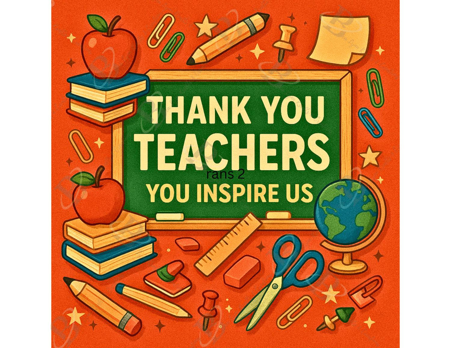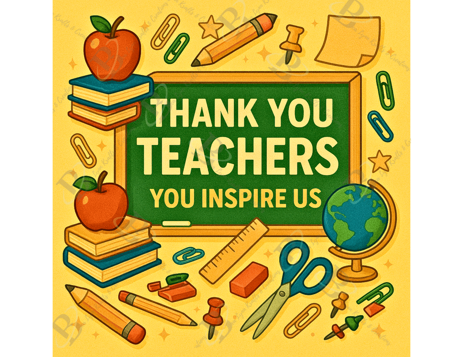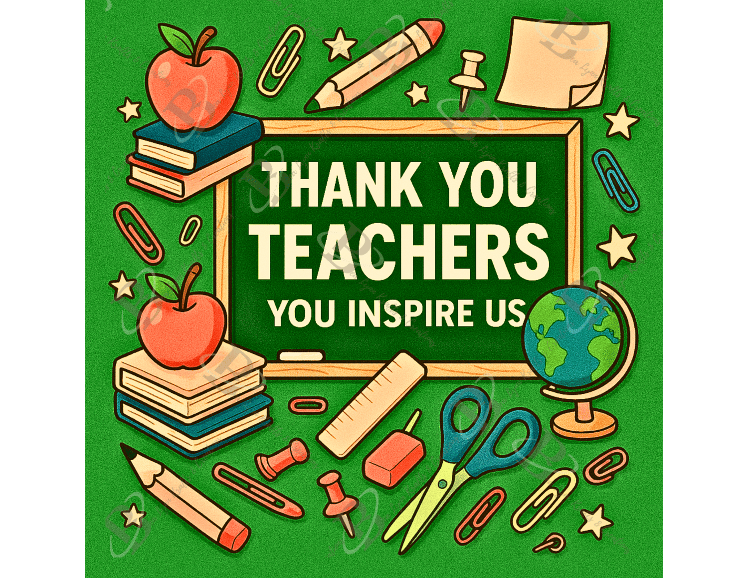 Celebrate and honor the incredible teachers in your life with these three bright and beautifully designed Teacher Appreciation PNG images! Each design features vibrant school-themed illustrations — including apples, books, pencils, scissors, paper clips, and a chalkboard with the uplifting message: “Thank You Teachers, You Inspire Us.”