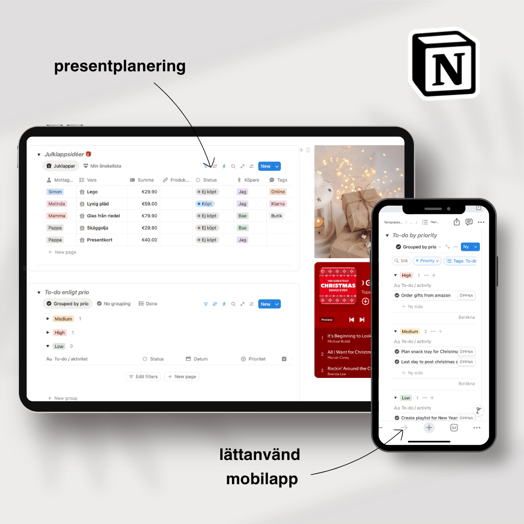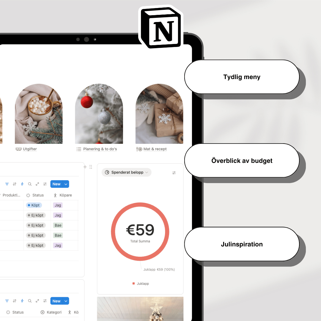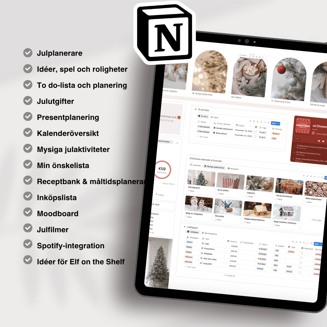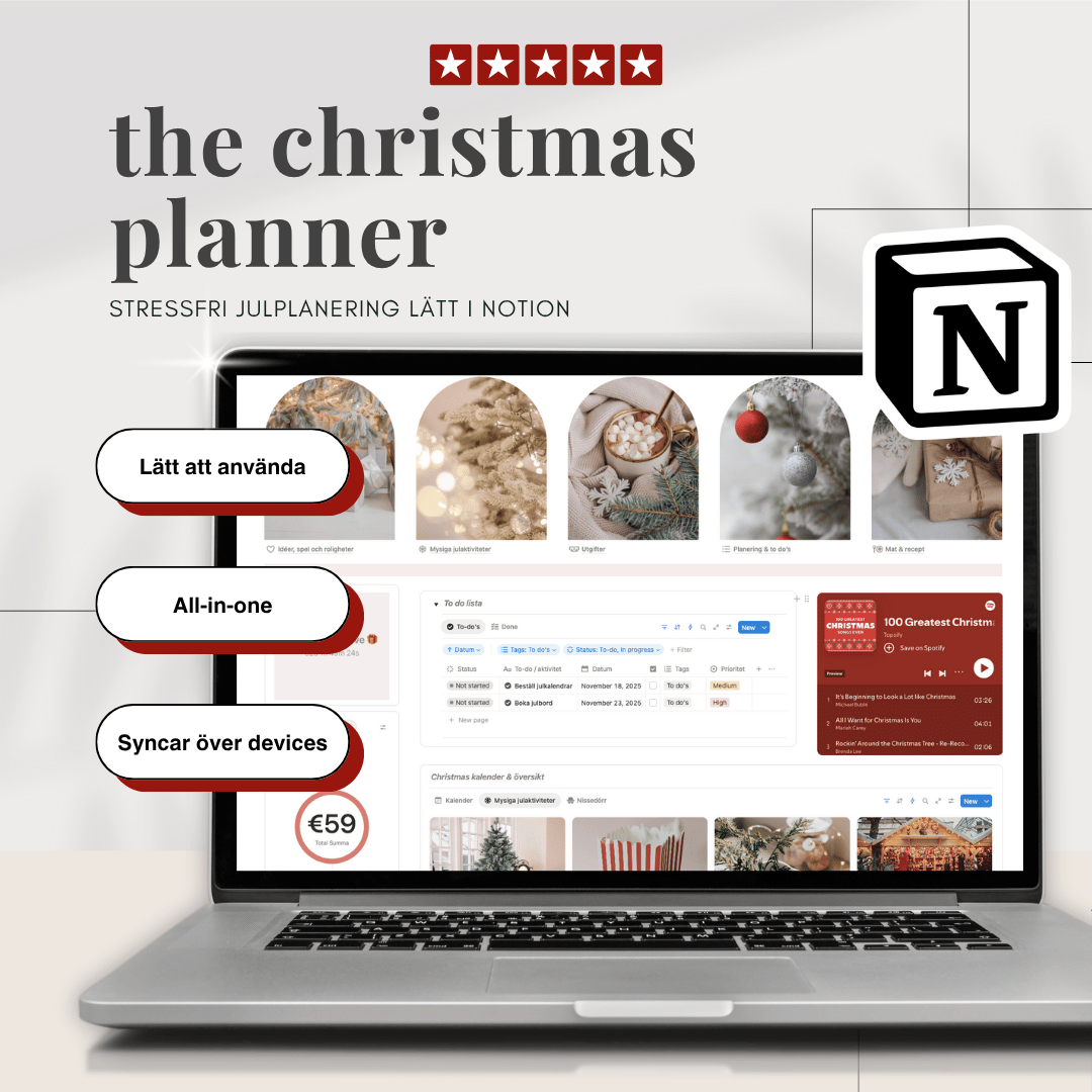 Den här Notion-mallen hjälper dig att planera allt inför julen, från julklappar och matlagning till budget och festligheter. Så att du kan njuta av högtiden utan kaoset. ✨