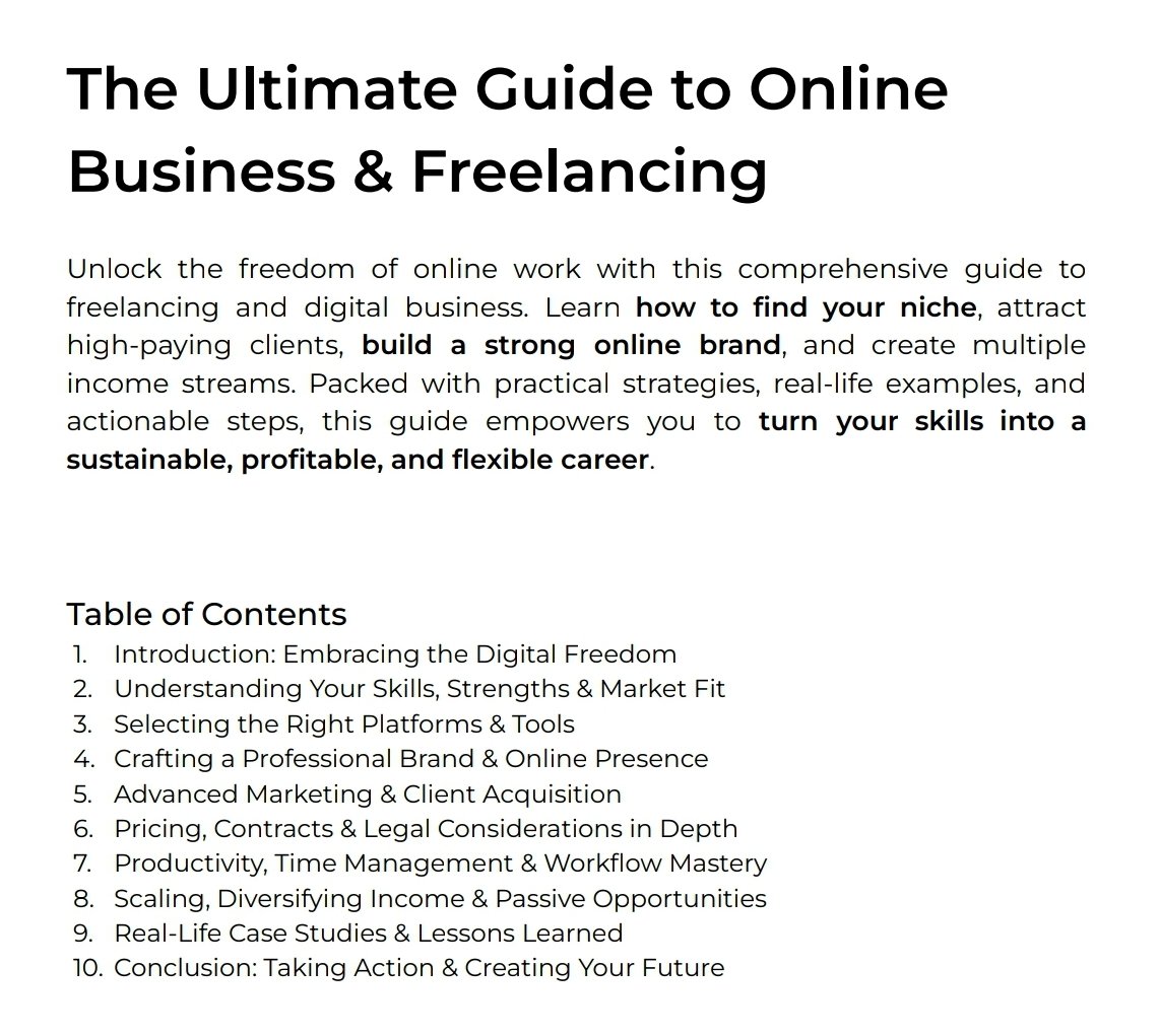 Unlock the freedom of online work with this comprehensive guide to freelancing and digital business. Learn how to find your niche, attract high-paying clients, build a strong online brand, and create multiple income streams.