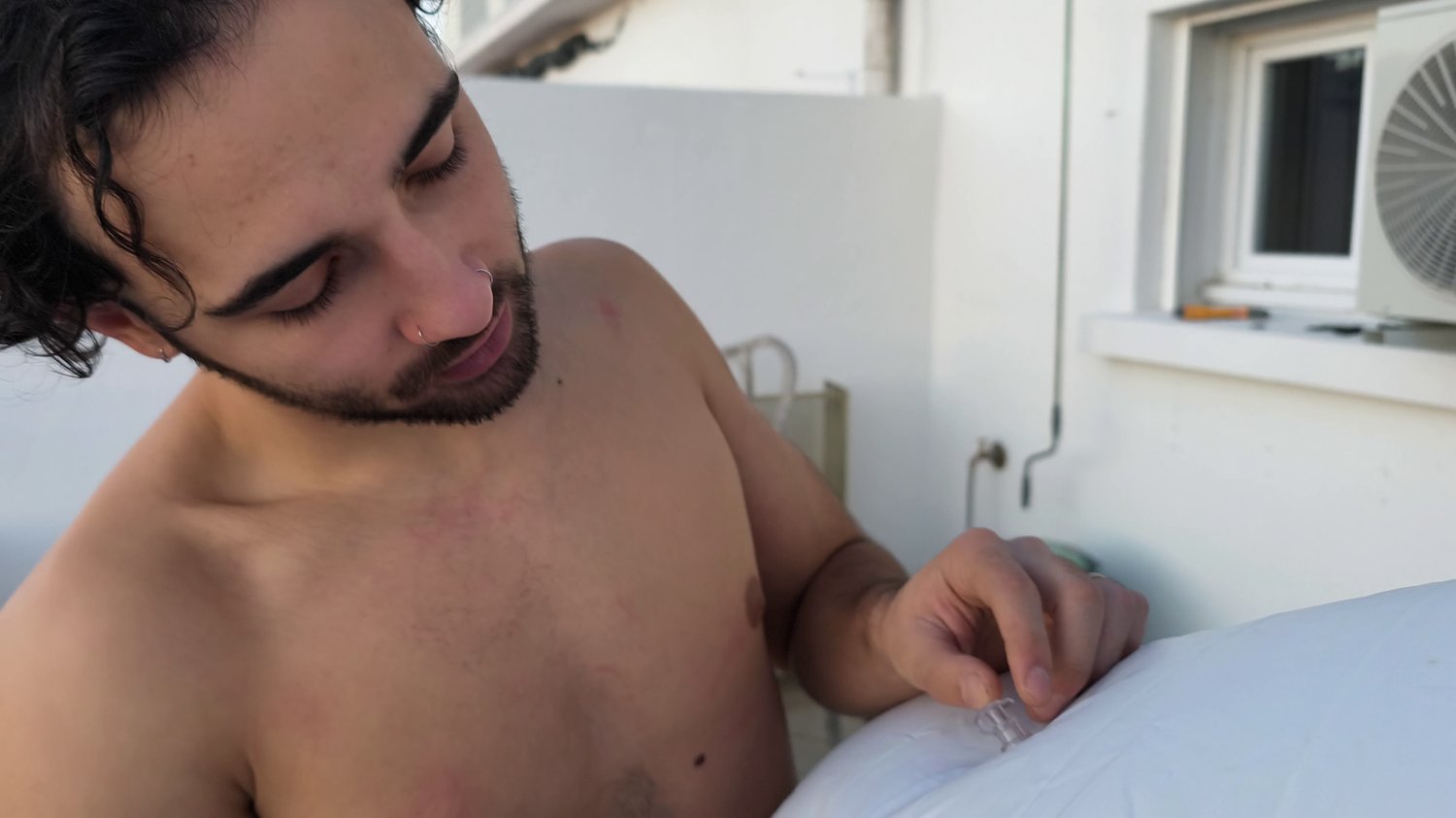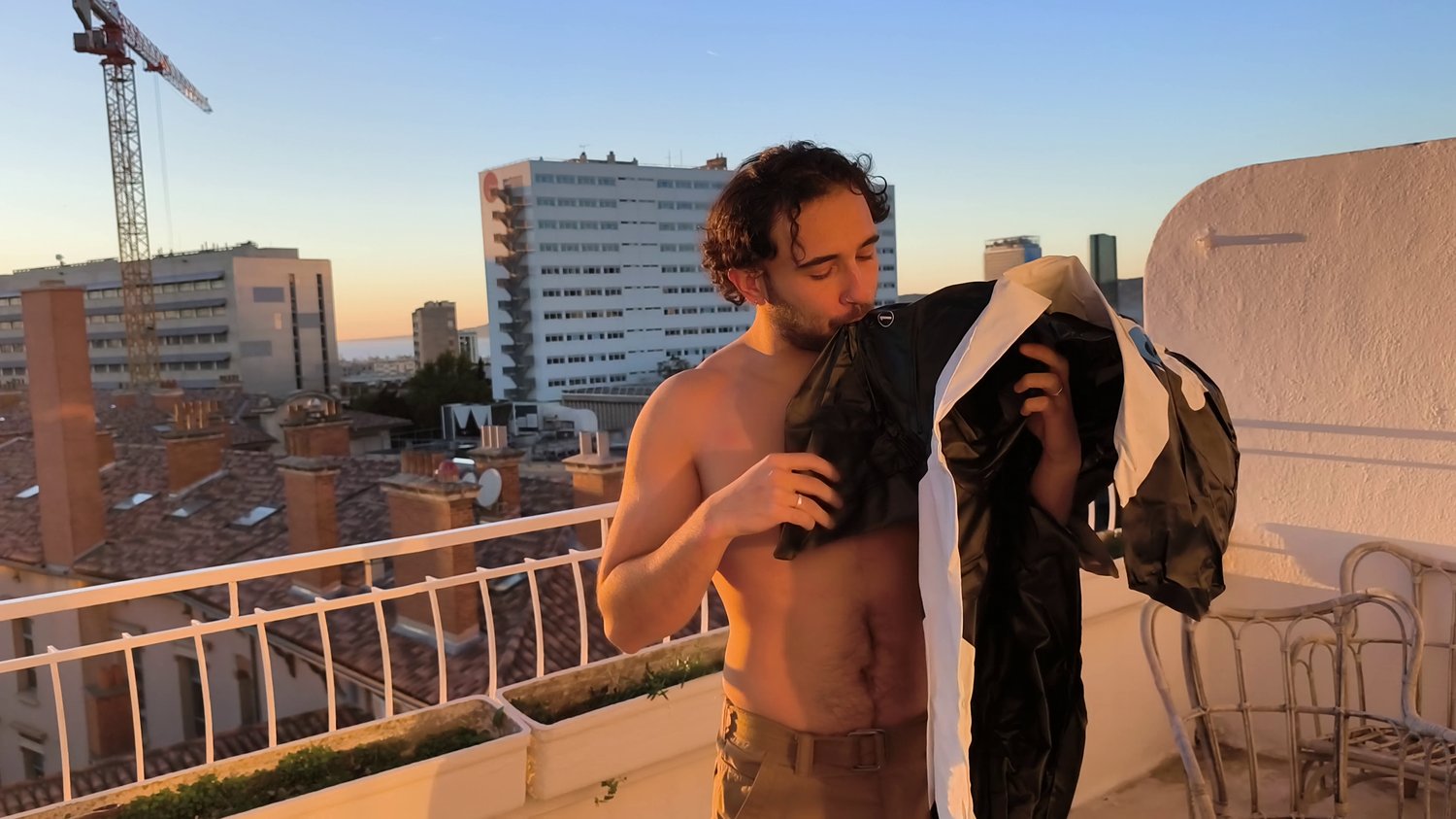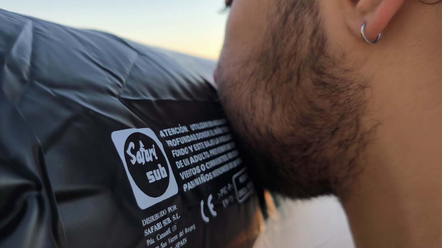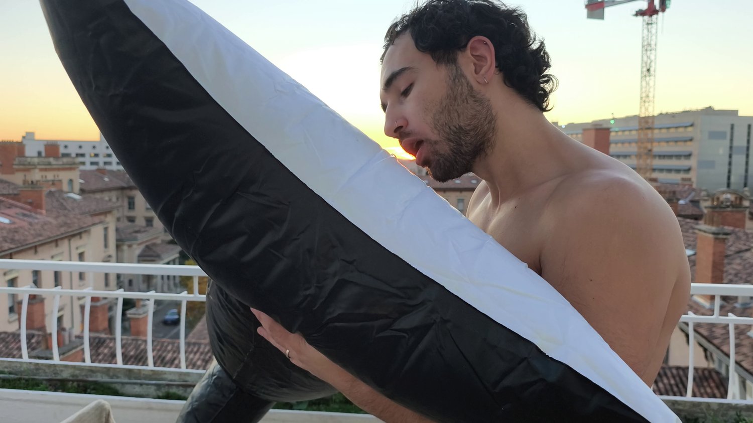 In this one he takes his time to blow one inflatable orca on the rooftop of my air bnb.